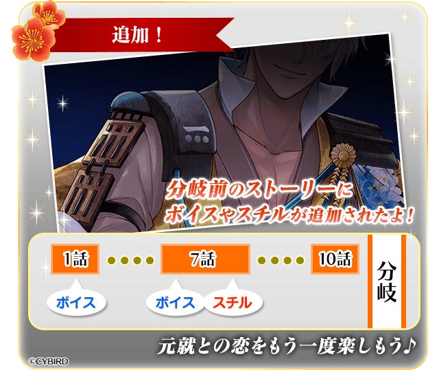 ・「毛利元就」本編の1話と7話のストーリーにボイスやスチルが追加されています。もう一度1話から本編を読む方にもよりリッチにお楽しみいただけます。