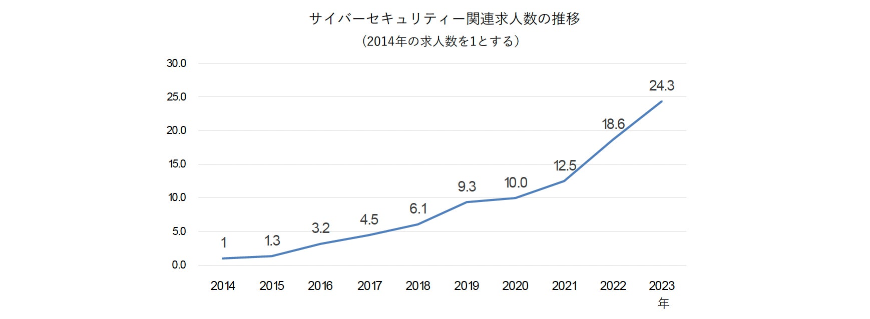 『リクルートエージェント』におけるサイバーセキュリティー関連の求人数推移を分析すると、2014年を1とした際、2023年は24.3倍と大きく伸長しています。サイバー攻撃への懸念の高まりから右肩上がりで推移していますが、特に2018年から2019年にかけてと、2020年以降で求人の伸びが大きくなっています。