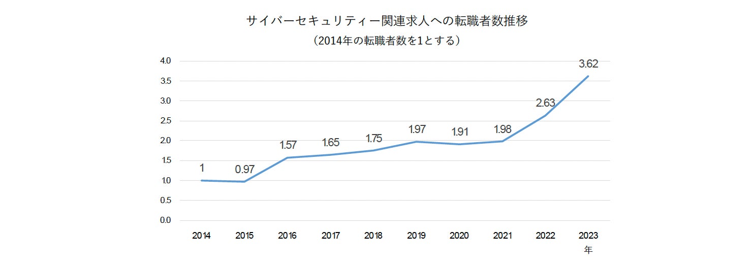 一方、転職者数の伸びは2014年比で3.62倍でした。近年は急増しているものの、求人数の急激な伸び幅と比べると小さく、企業のサイバーセキュリティー関連人材へのニーズに転職者数が追いつかない状況が表れています。