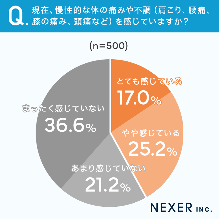 4割以上の人が日常的に体の不調を感じながら生活しているという結果は、慢性的な痛みがいかに身近な問題であるかを物語っています。