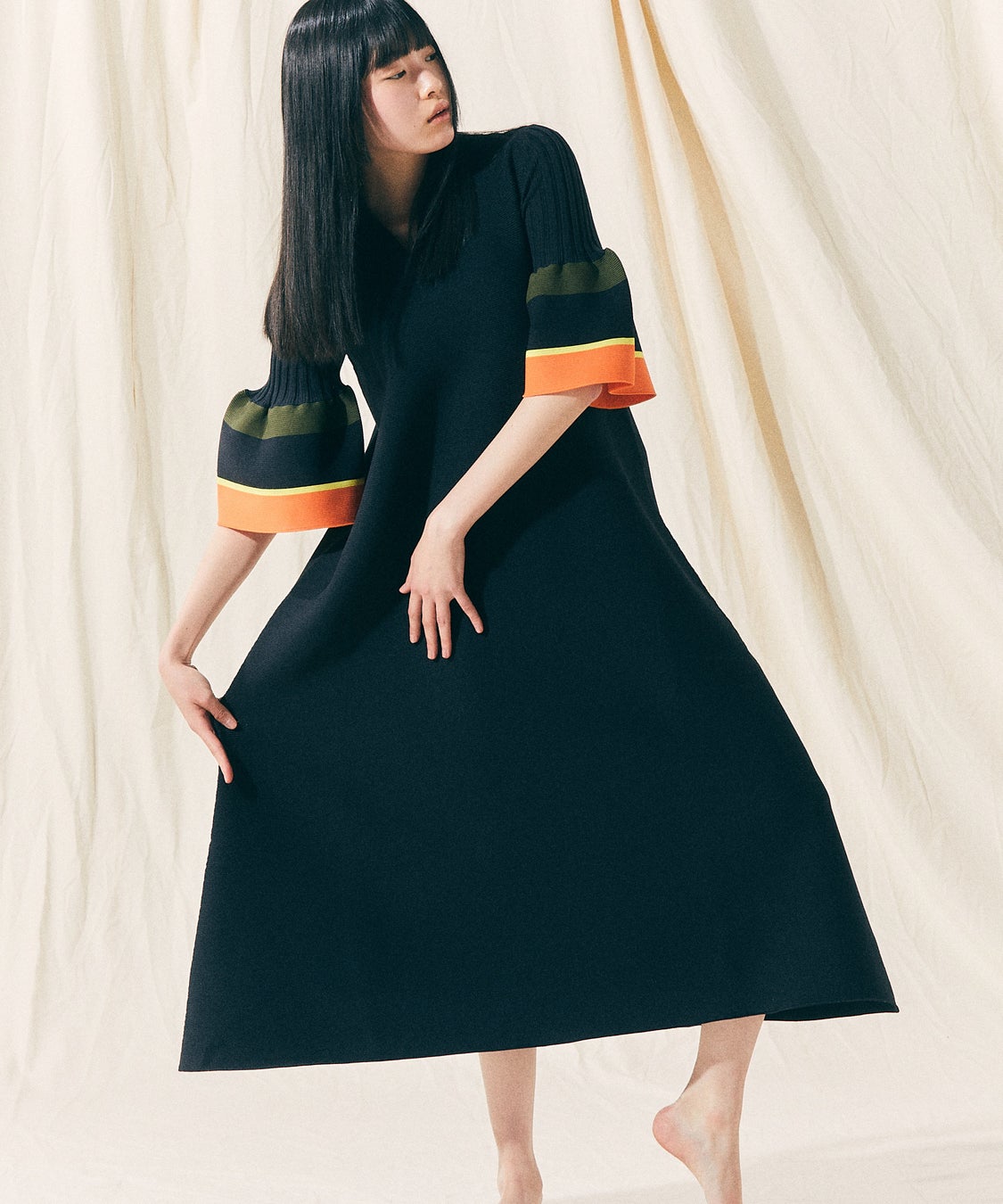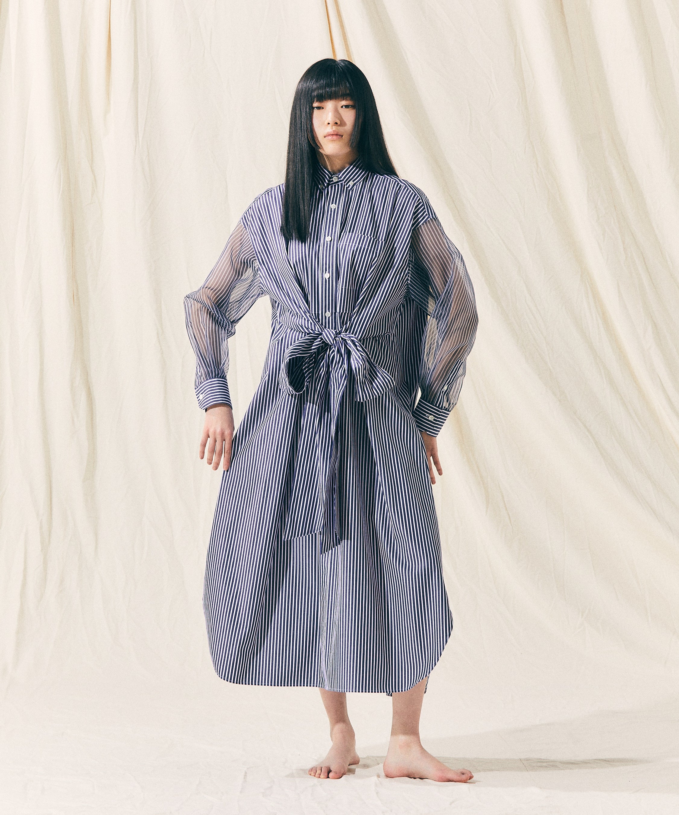 HERITAGE AND EVOLUTION(服飾の歴史、遺産を自らの感性で独自に進化させる)をコンセプトに、ミリタリーアイテムをソースに現代的なデザインへと昇華させる<ハイク>。ブランドの春夏を象徴するストライプ柄のシャツドレスのスリーブ部分をシアー素材に切り替えアップデートしました。