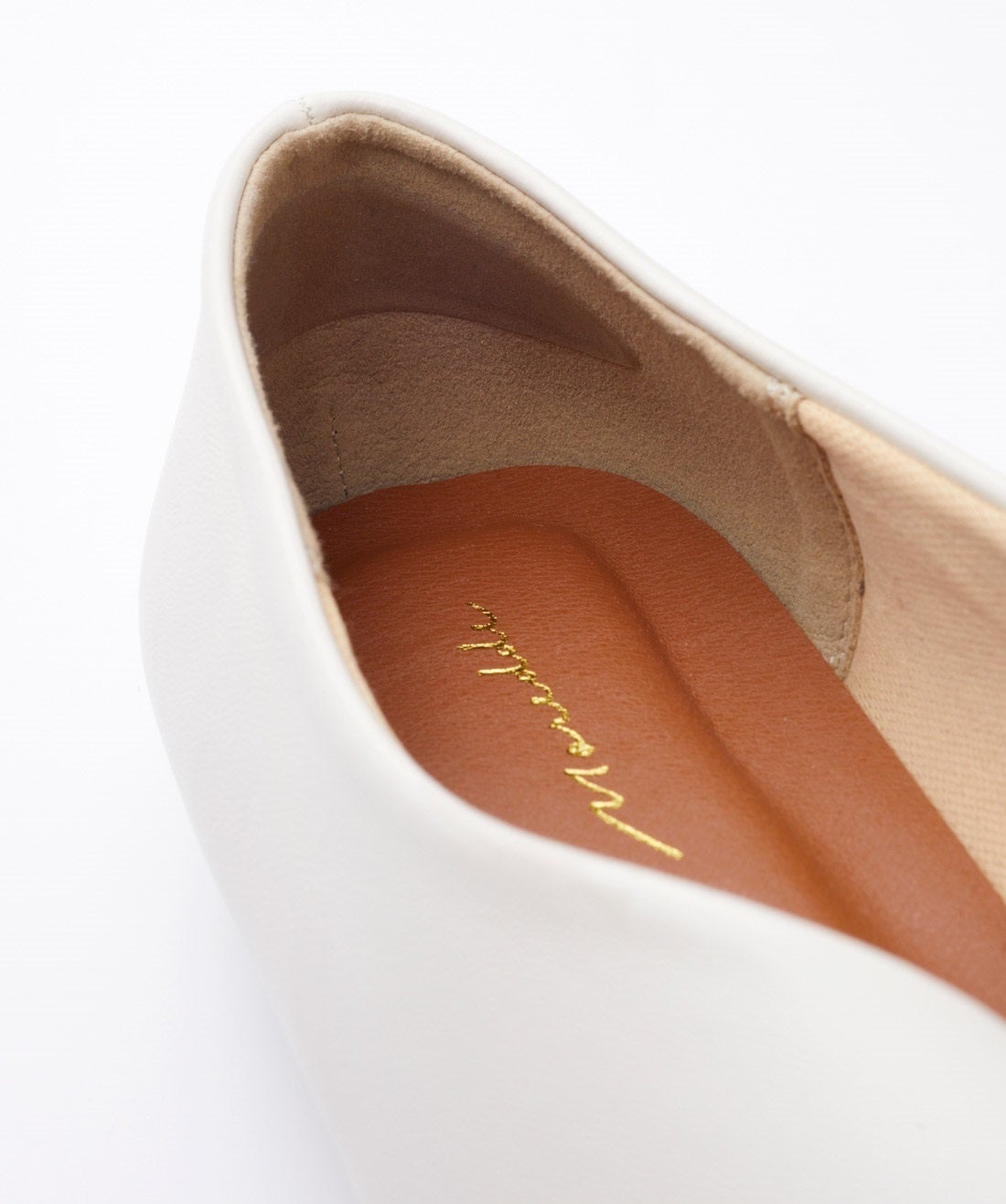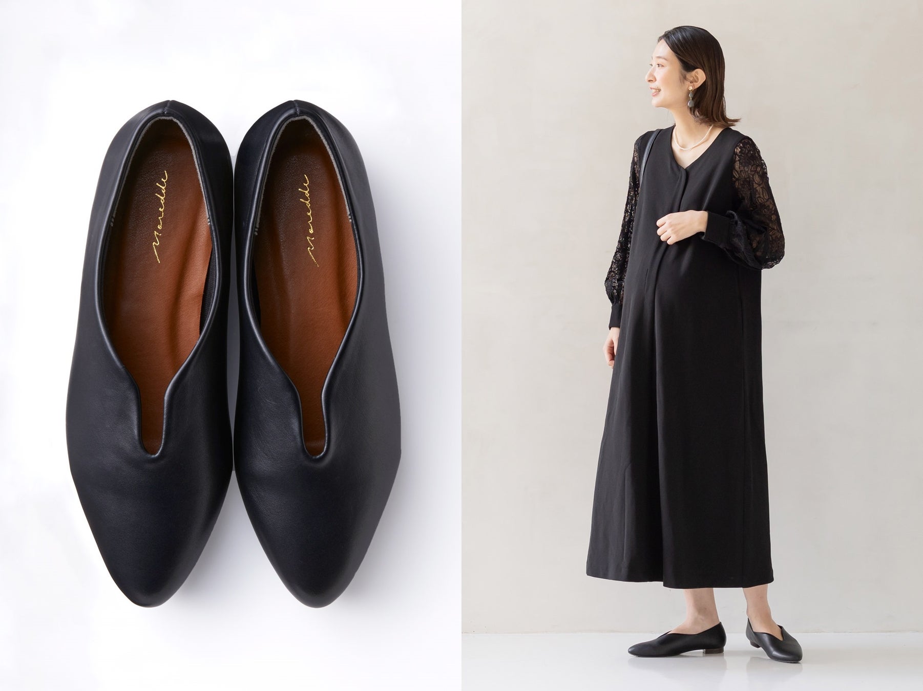 マタニティ期はたくさん歩くのが大事と言われたり、産後はベビーカーで出かけたりすることが多く、ママは歩く機会が増えます。そこで素材に柔らかい合皮素材を使い、インソールにはフカフカのクッションを入れています。また、ペタンコすぎるフラットシューズは疲れやすいというママスタッフの声から、歩きやすい1.4㎝ヒールにしています。調整用のインソールが1組付属しているので、ちょうどよいサイズ感に合わせられ、疲れを軽減できるポイントです。