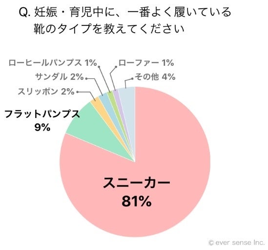 約80%のママが妊娠・育児中に一番よく履いている靴のタイプは「スニーカー」と回答。妊婦さんや育児中ママの鉄板アイテムともいえるスニーカーが第1位となりました。「痛くなりにくい」「疲れにくい」という歩きやすさが支持されています。