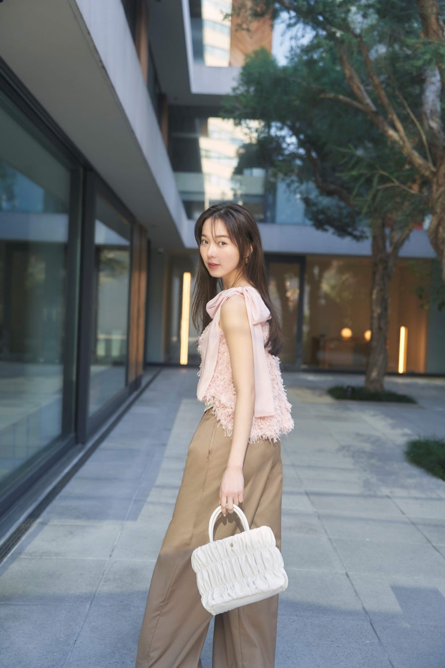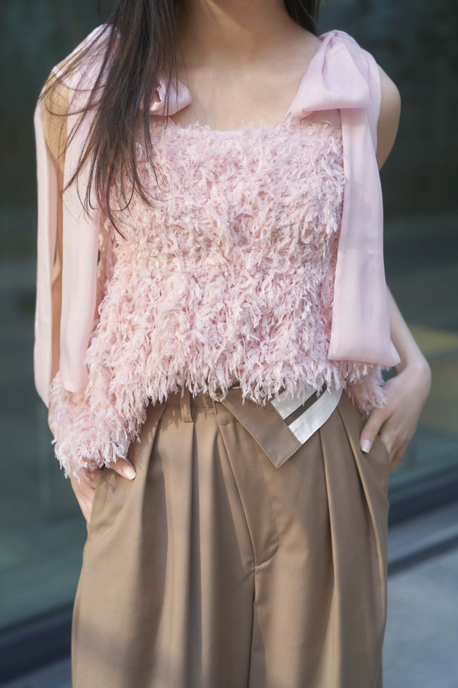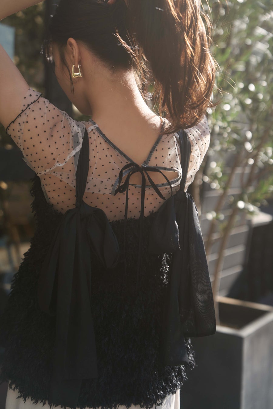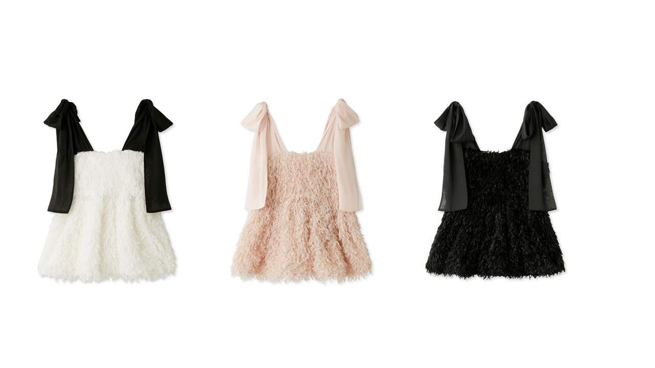表情感のあるフェザーライクな素材が愛らしいリボンビスチェ。