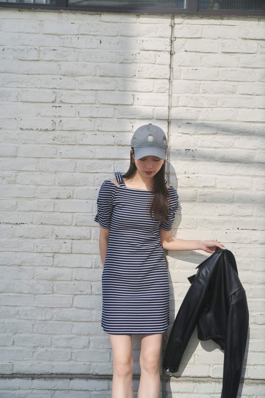 カジュアルとフェミニンの絶妙なバランスを演出したボーダーカットソーワンピース。