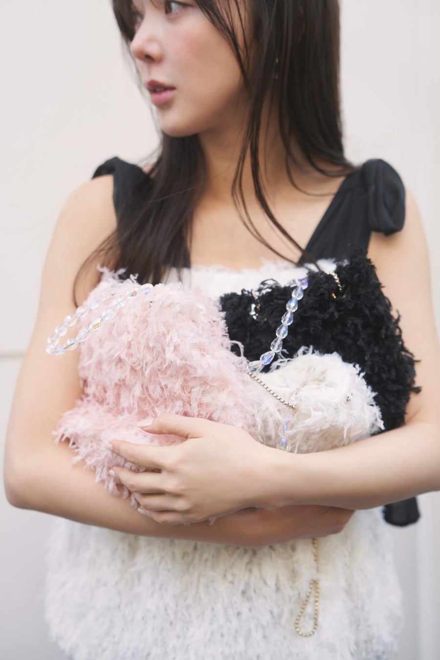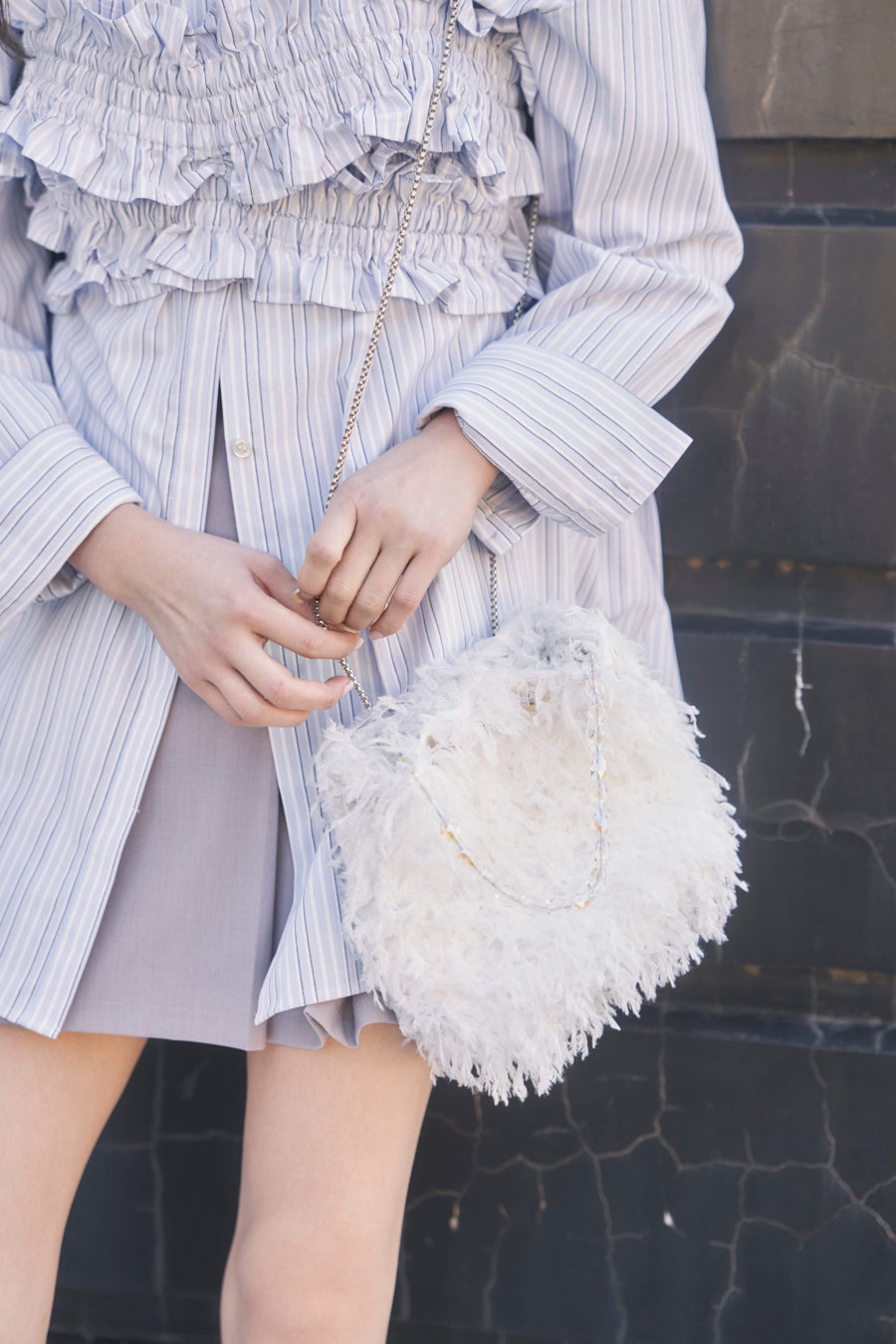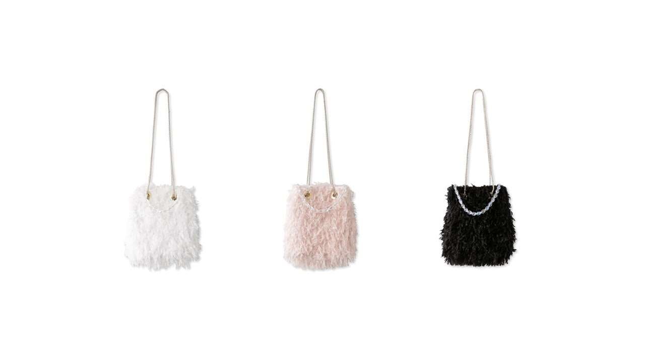 コロンとしたフォルムに表情感のあるフェザー素材を使用したチェーンバッグ。