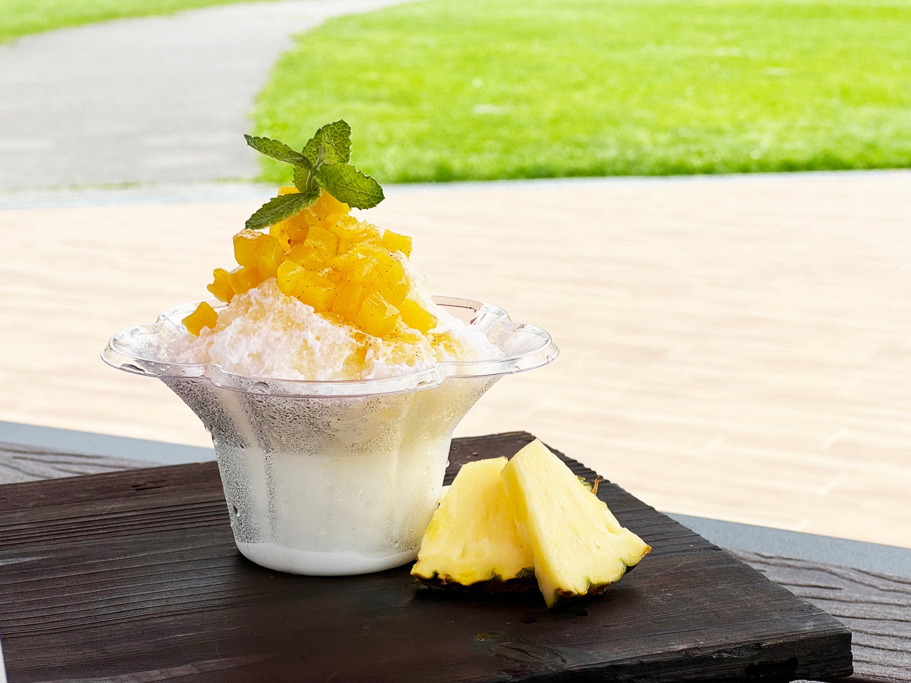 夏の王道パイナップルの果実と爽やかなパッションフルーツ、軽やかなココナッツの風味がよく合う氷とフルーツを一緒に楽しむかき氷。