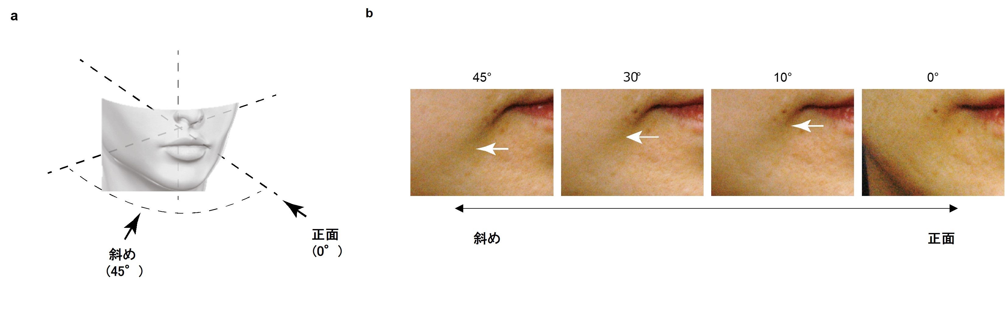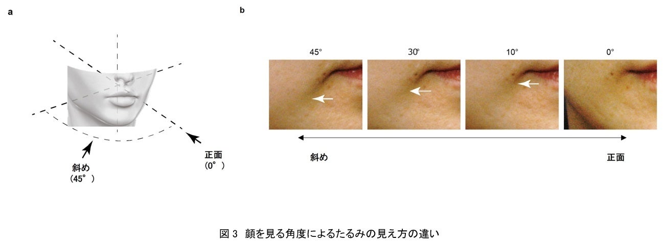 次に、このたるみ認識のギャップが生まれる原因を検討しました。様々な角度から対象者の顔の写真を撮影して比較したところ、正面から撮影した顔では、たるみを検出することは困難で、斜め方向から撮影した顔では、たるみが明確に認識できることが明らかになりました (図3)。これは、斜めから見た場合には、立体的な顔の形状の把握が容易なためと考えられます。日常生活の中では、鏡で自分の顔を正面から見る機会は多いものの、斜め方向から見ることは少なく、たるみの認識が困難な正面の顔を基に、自身のたるみ程度を認識していると考えられます。
