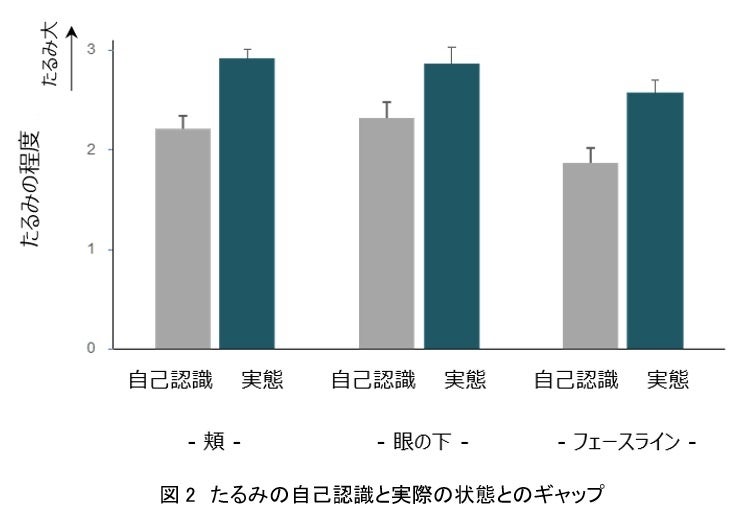 この方法を使いて、30~40代の日本人女性36名を対象とし、たるみが顕著に起きる頬、目、フェースラインに関して、自己認識と実際の状態の測定を行いました。その結果、たるみの自己認識は、3部位とも本人の自己認識の方が、実際の状態よりも有意に低く、たるみが少ない状態と認識していることが明らかになりました(図2)。また、この差を、たるみ度合いと年齢との関係を表す数式※4にあてはめ年齢に換算すると、頬部では8.1歳の差となりました。この結果から、自身のたるみの状態は正確に把握されていないことがわかりました。