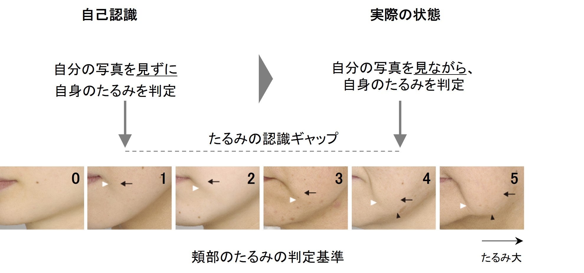 頬部での測定例。対象者は、写真を用いた6段階のたるみ判定基準を見ながら自身のたるみ程度を判定する。マリオネットライン(白い矢印)と肌の膨らみ(黒矢印)の位置を基に、たるみ程度を判定する。自身の写真を見ずに判定した結果をたるみの「自己認識」、自身の写真を見ながら判定した結果をたるみの「実際の状態」とし、例えば前者が「1」、後者が「4」の場合には、たるみの自己認識と実際の状態との「ギャップ」は「3」とする。
