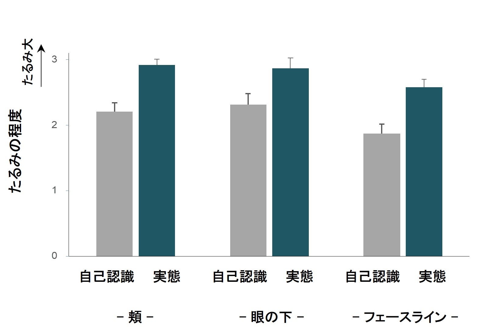 たるみの実際の状態は、3部位ともに自己認識は、実際の状態(実態)よりも低く、自身のたるみを実際よりも少ないと認識していることがわかった