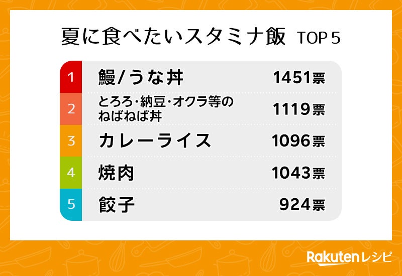 夏に食べたい「スタミナがつく、がっつり系料理」を複数回答形式で聞いたところ、1位「鰻/うな丼」(1,451票)、2位「とろろ・納豆・オクラ等のねばねば丼」(1,119票)、3位「カレーライス」(1,096票)、4位「焼肉」(1,043票)、5位「餃子」(924票)という結果でした。食欲を刺激し、夏バテ対策やスタミナ補給になる「スタミナ飯」が上位に多く挙がりました。