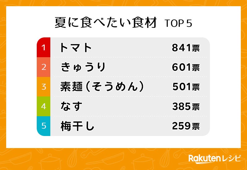 夏に食べたい食材を複数回答形式で聞いたところ、1位「トマト」(841票)、2位「きゅうり」(601票)、3位「素麺」(501票)、4位「なす」(385票)、5位「梅干し」(259票)という結果でした。「トマト」は2位の「きゅうり」に240票差をつける人気の食材であることが分かりました。