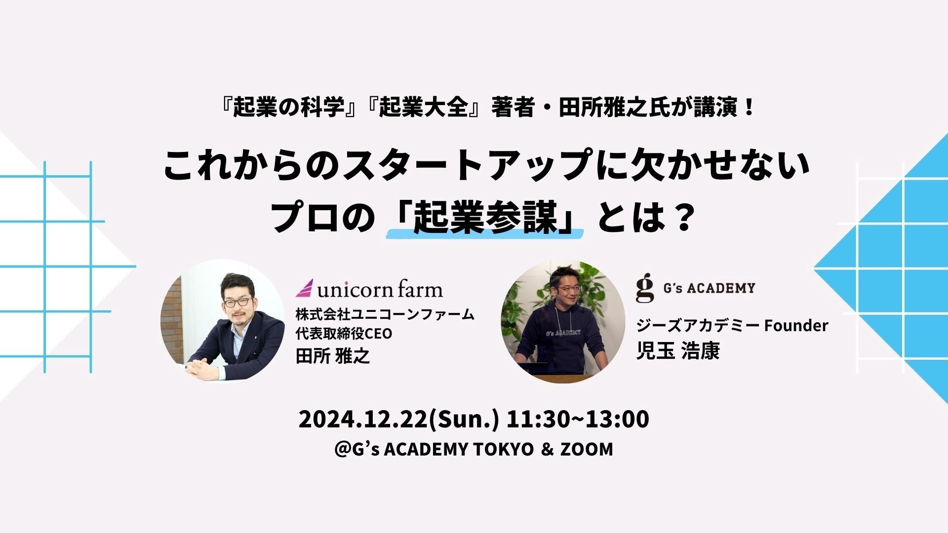 イベント後半では田所氏と、110社以上のスタートアップを輩出してきたジーズアカデミーのFounder、児玉浩康によるトークセッションを行います。最新のスタートアップ事情や、起業参謀・CxOとして求められる能力や資質について、双方の経験を元にディスカッションを繰り広げます。
