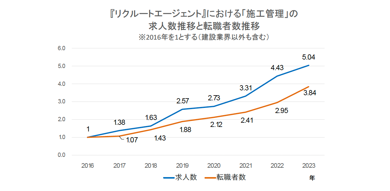 『リクルートエージェント』における「施工管理」求人数の推移を見ると、2016年を1として、2023年は5.04倍と伸長しています。転職者数も2016年を1として、2023年は3.84倍と伸長していますが、その伸びは求人の伸びに追いついていない状況が続いています。