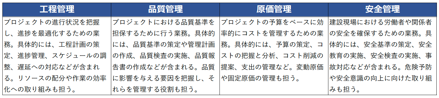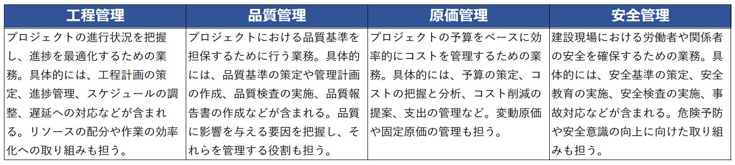施工管理は、ゼネコン(総合建設会社)、サブコン(専門建設会社)、ハウスメーカー、土木工事を行うインフラ系企業、プラント、建材メーカーなどにおいて、工事の管理を行う仕事です。「4大管理」と呼ばれる「工程管理」「品質管理」「原価管理」「安全管理」が主な業務となります。施工管理はどのような建設現場においても必要な存在で、建設業界において非常に重要な役割を担っています。
