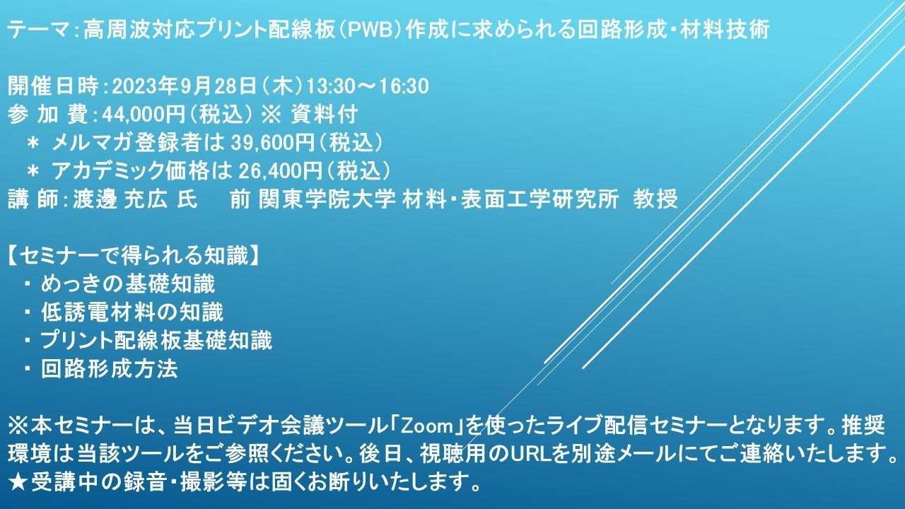 【ライブ配信セミナー】高周波対応プリント配線板(PWB)作成に求められる回路形成・材料技術 9月28日(木)開催 主催:(株)シーエムシー・リサーチ