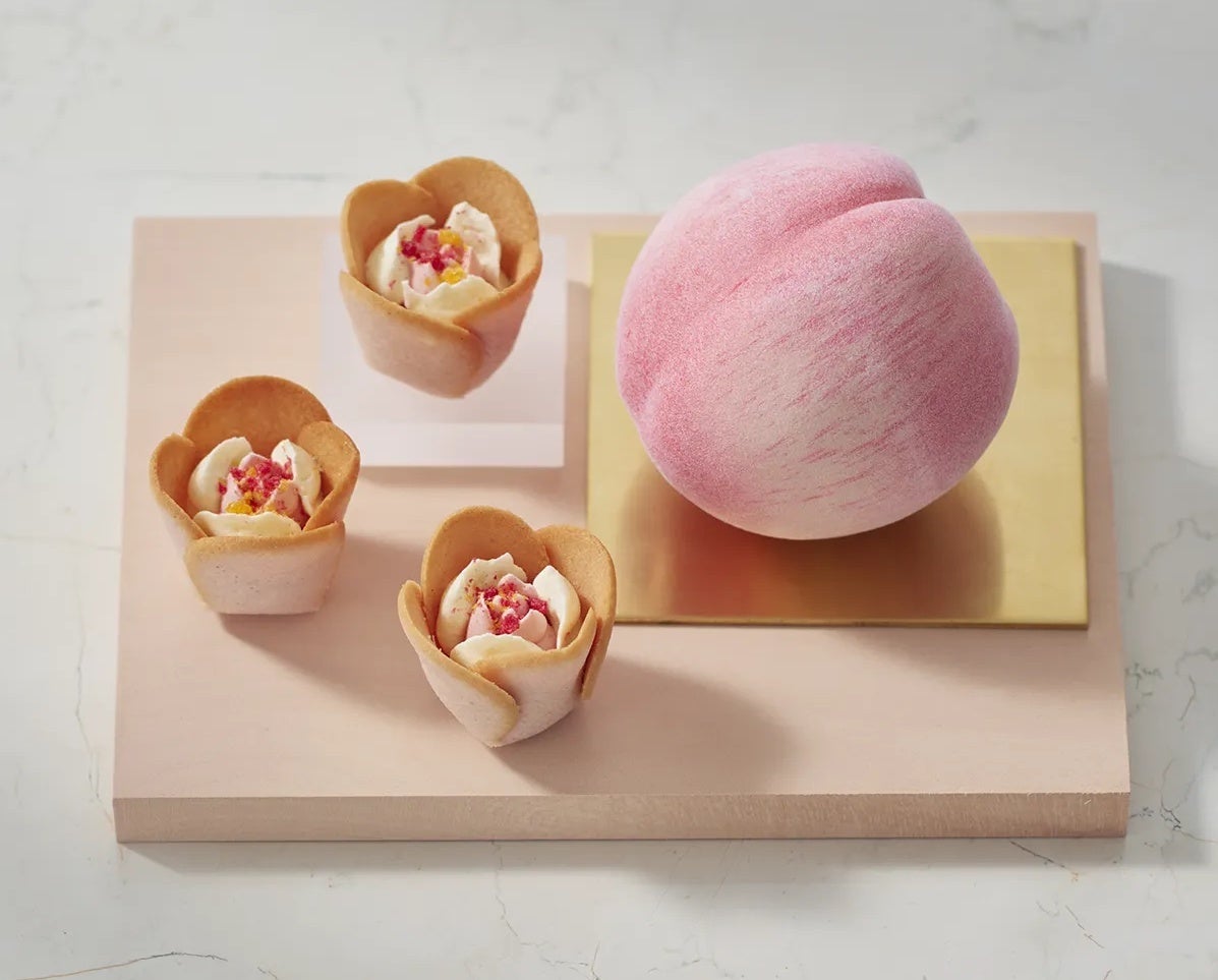 タルトにケーキ、グラスデザートにジュース、マカロンからサラダまで。桃好きにはたまらない、アイテムが多彩にラインアップします。