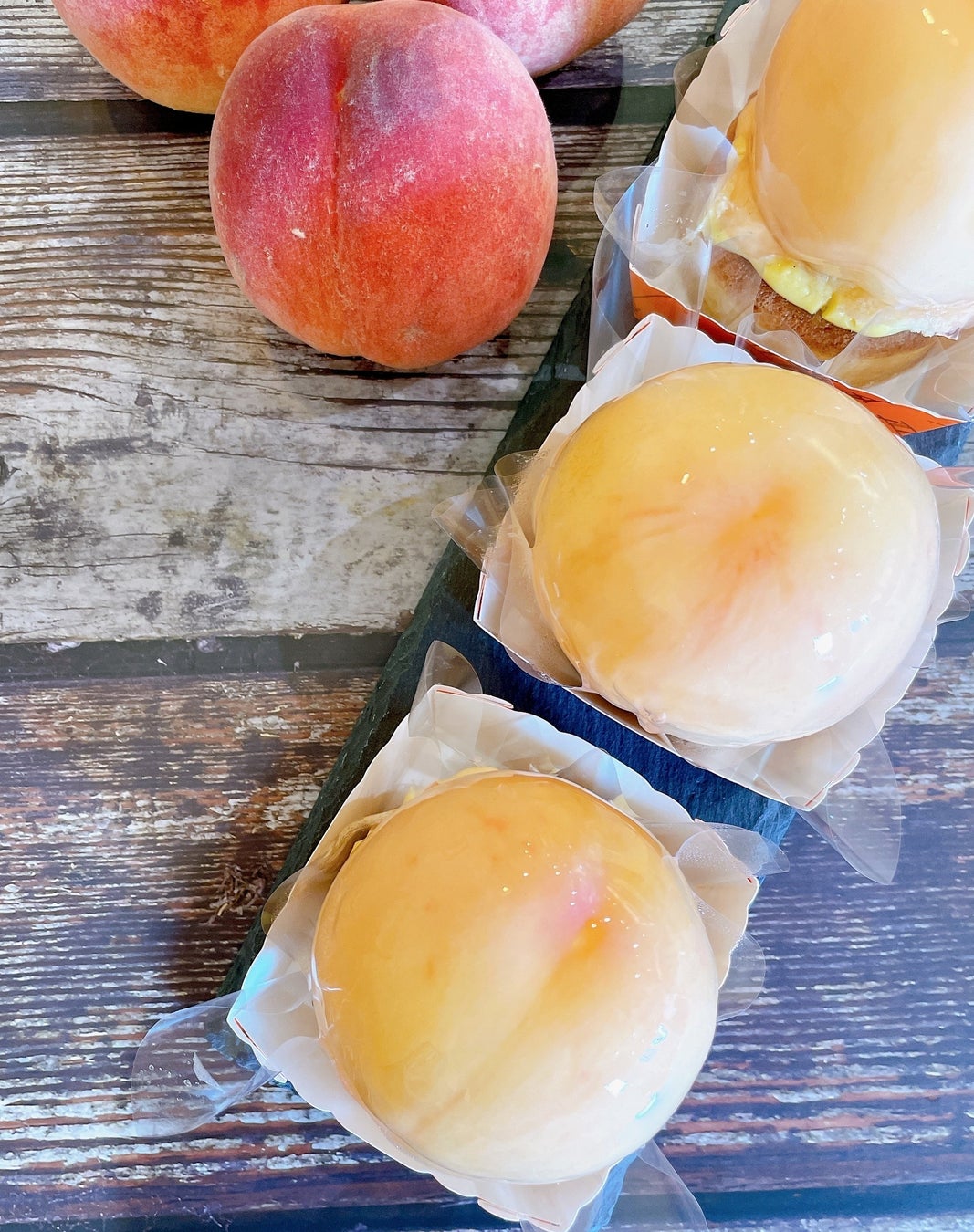 旬のフルーツや素材の旨みを活かしたスイーツを提案する、大阪・太子橋にある「カフェ&スイーツ シェルフィ」。旬の桃を丸ごと1個使用した贅沢なスイーツ。桃の中にはカスタードクリームとミックスベリーを入れて仕上げました。