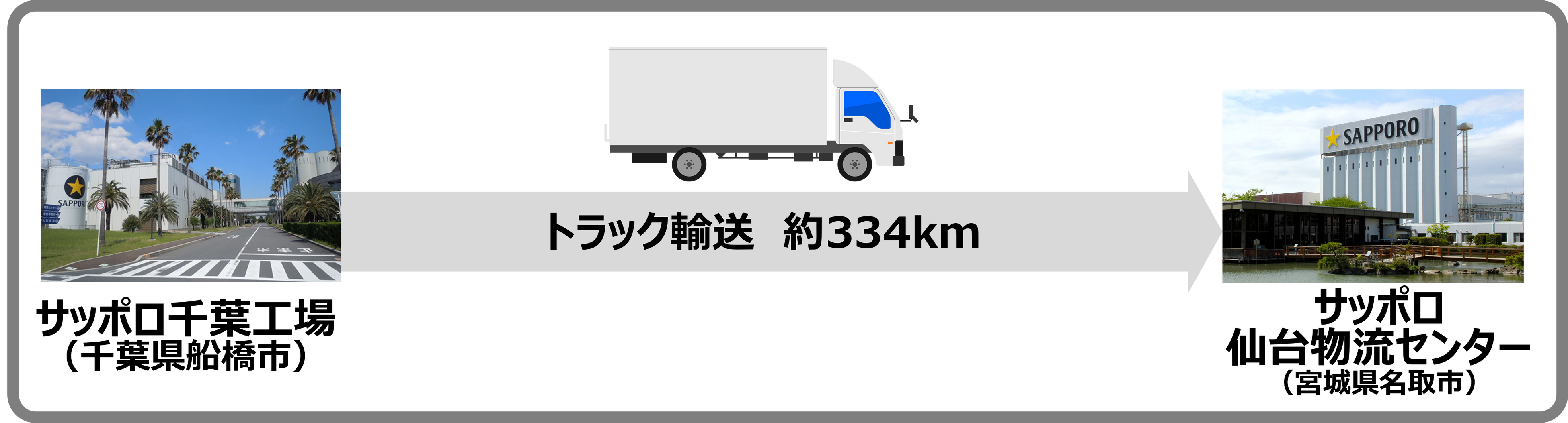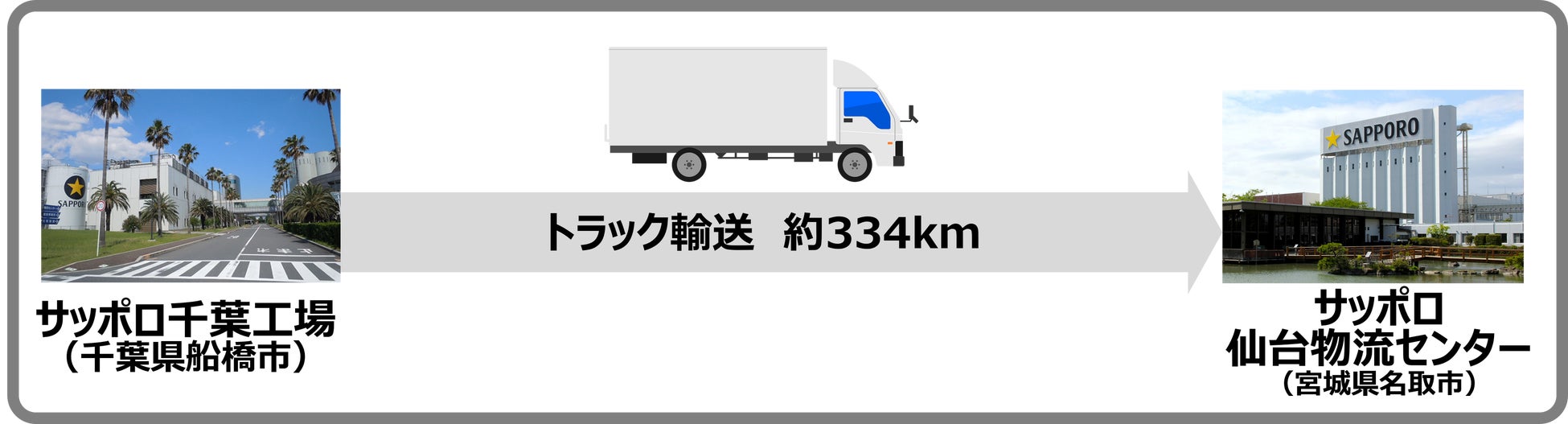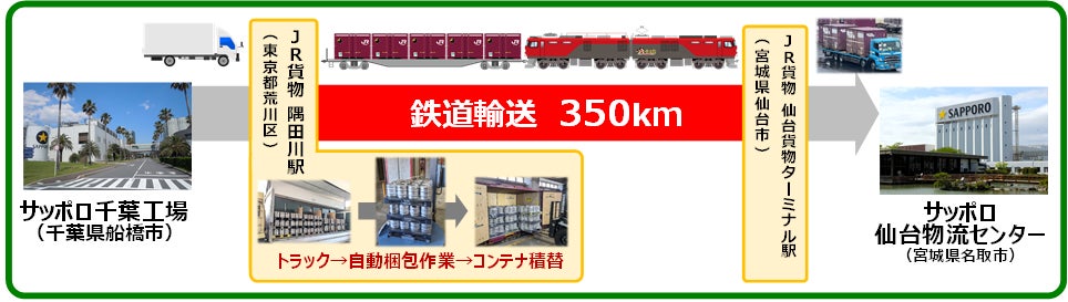 サッポロビール千葉工場(千葉県船橋市)→JR貨物隅田川駅(東京都荒川区)→JR貨物仙台貨物ターミナル駅(宮城県仙台市)→サッポロビール仙台物流センター(宮城県名取市)
