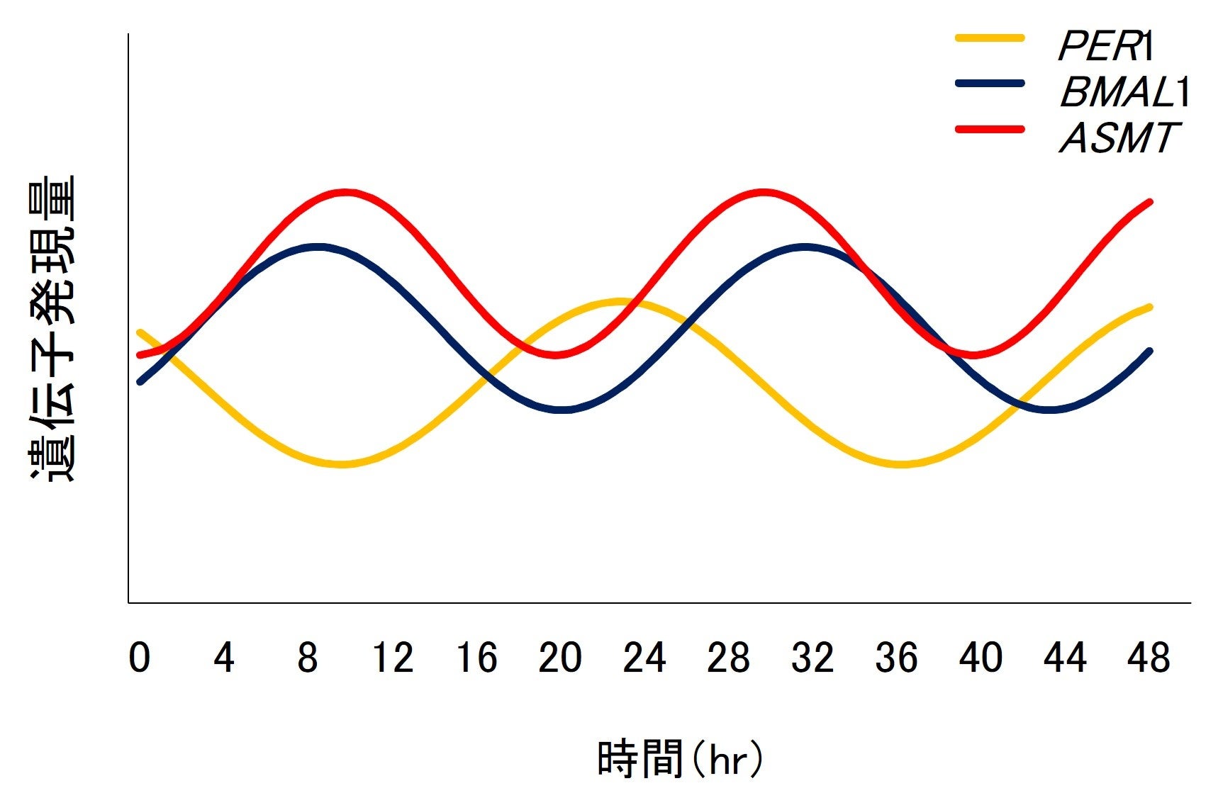 ASMT(肌でのメラトニン合成関連遺伝子)の遺伝子発現が、BMAL1(夜に発現が高まる遺伝子)と同様の変化をし、PER1(昼に発現が高まる遺伝子)とは逆の動きをしていることから、肌でのメラトニン合成は夜に高まることが示された。