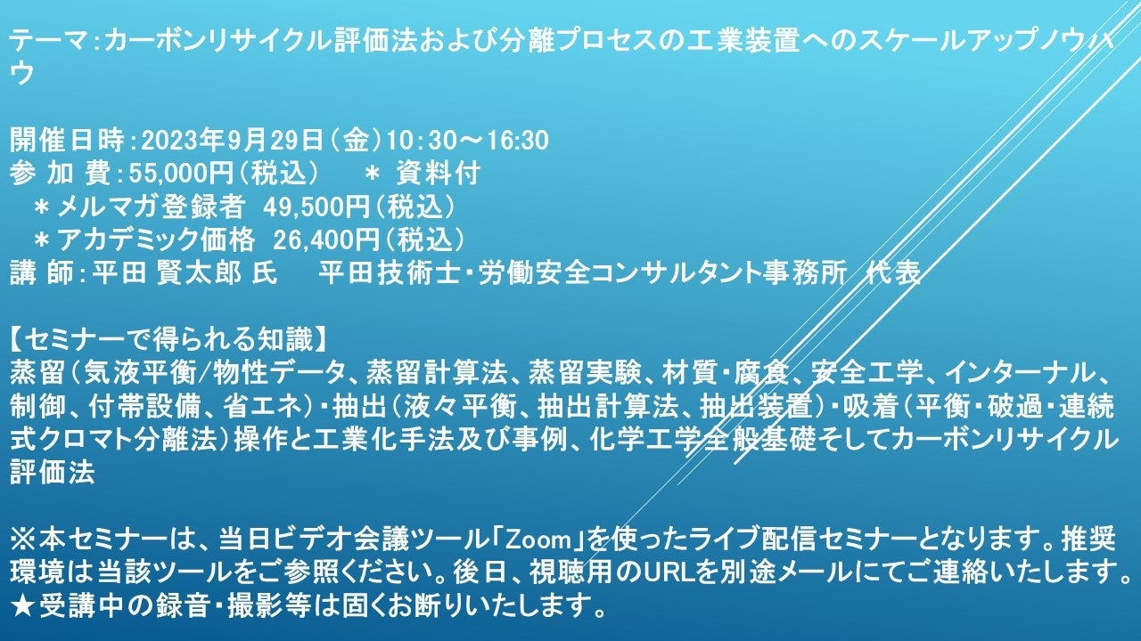 【ライブ配信セミナー】カーボンリサイクル評価法および分離プロセスの工業装置へのスケールアップノウハウ 9月29日(金)開催 主催:(株)シーエムシー・リサーチ