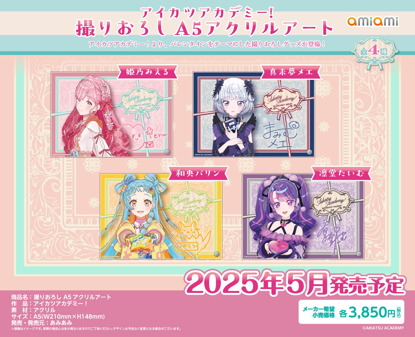 フィギュア&ホビー通販大手の「あみあみ」を運営する、大網株式会社(本社・東京都文京区)は、『アイカツアカデミー!』の【「バレンタイン」をテーマにした撮りおろしグッズ】全7商品を、2025年5月予定で発売いたします。