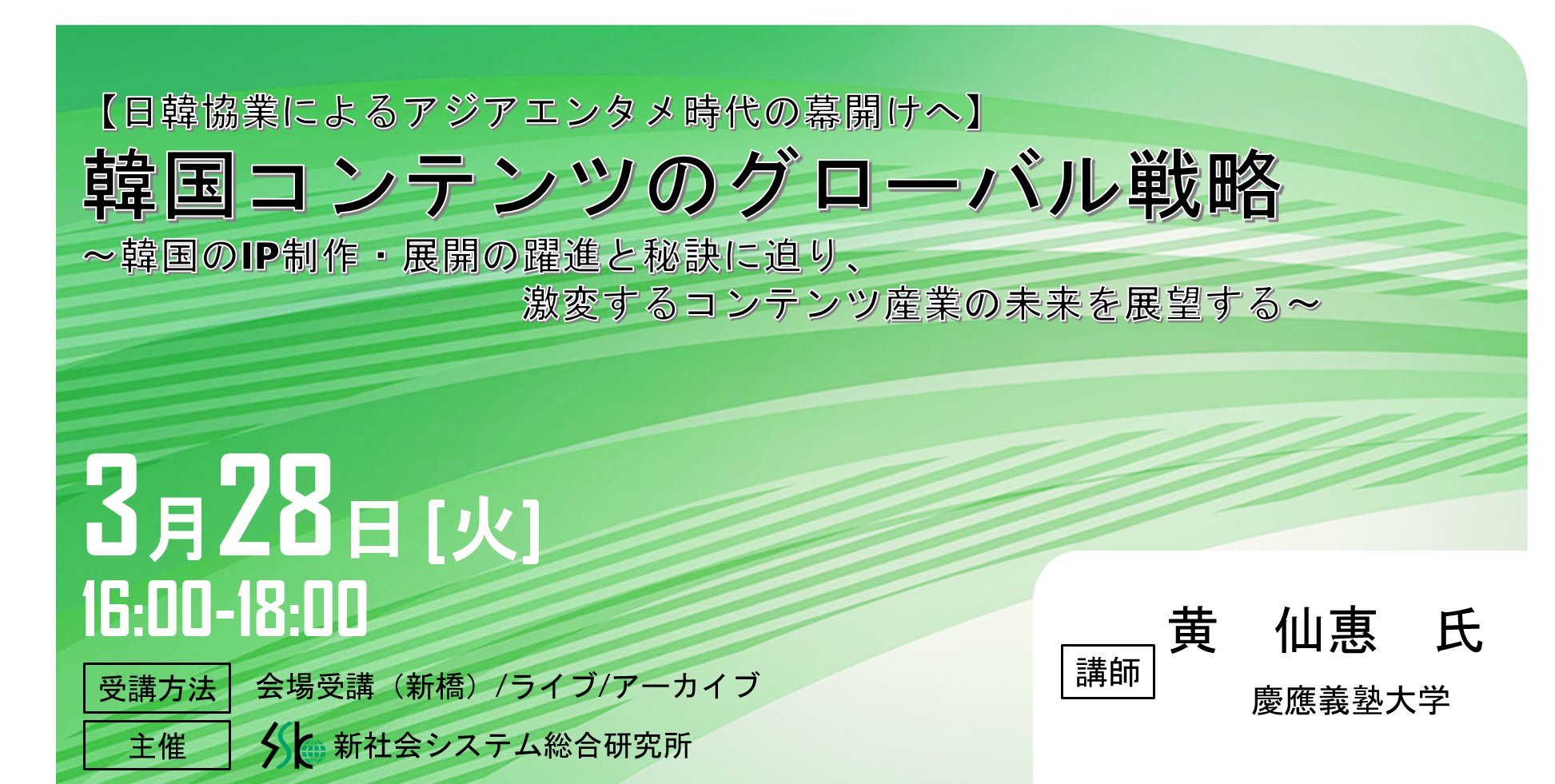 「韓国コンテンツのグローバル戦略」と題して、慶應義塾大学 黄 仙惠氏によるセミナーを2023年3月28日(火)に開催!!