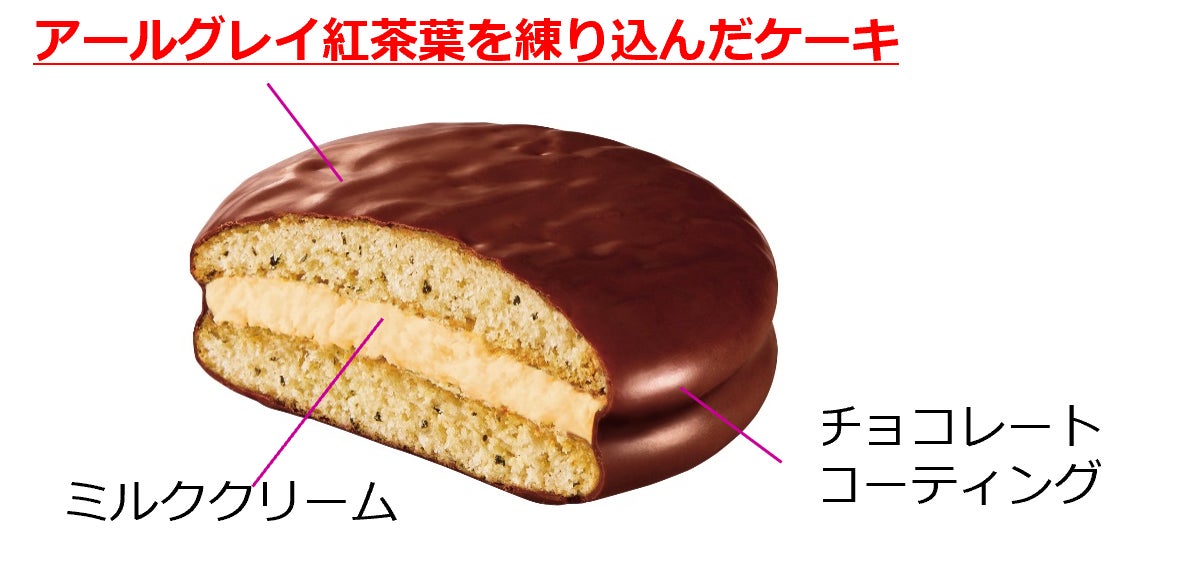 一般的に食べ物を召し上がる際に低温だと、香りを感じにくくなりますが、チョコパイで初めてとなるアールグレイ紅茶葉の裁断品をケーキに練りこむことで、冷やしていてもしっかりと香りを感じていただける商品に仕上げました。
