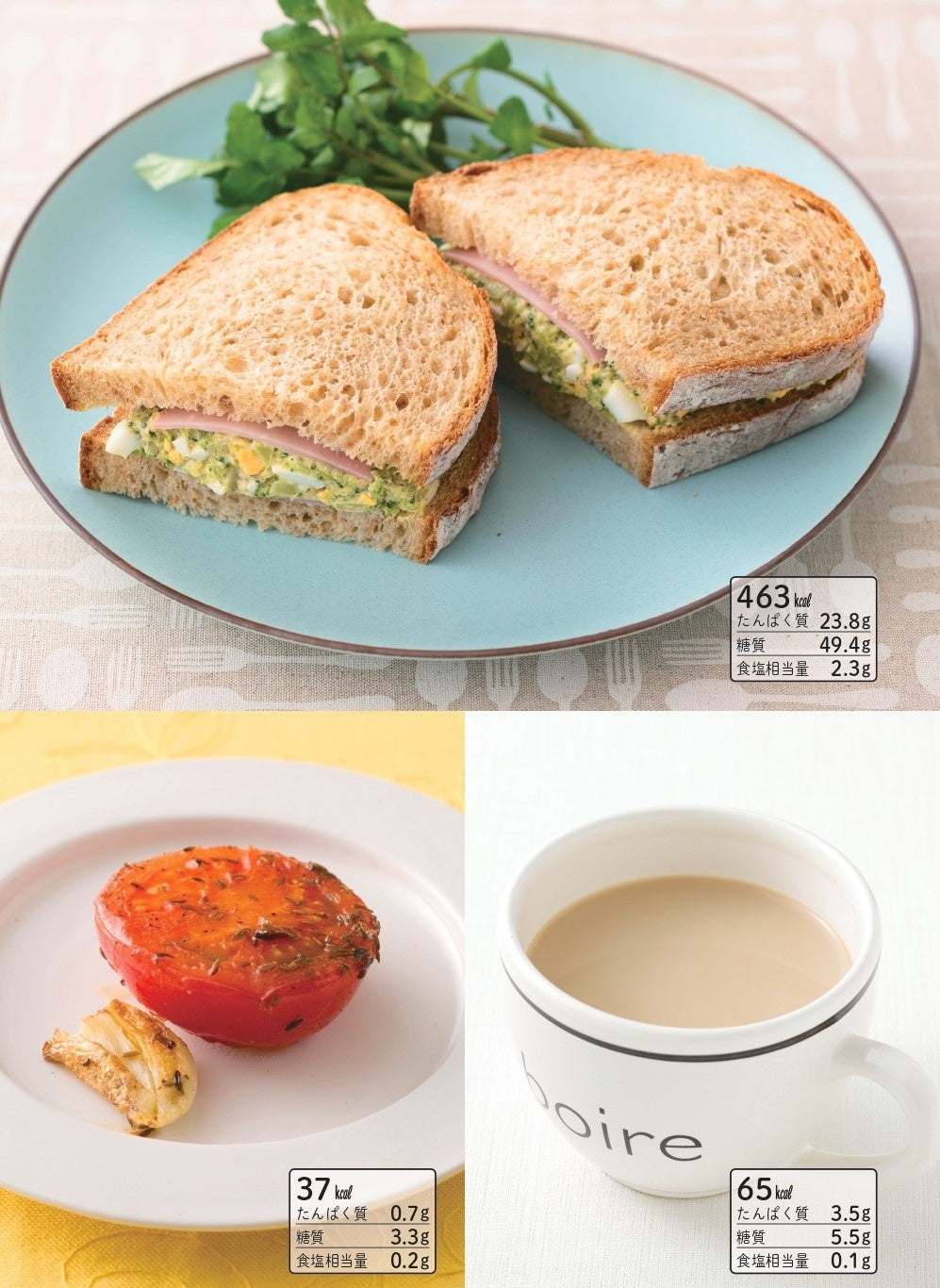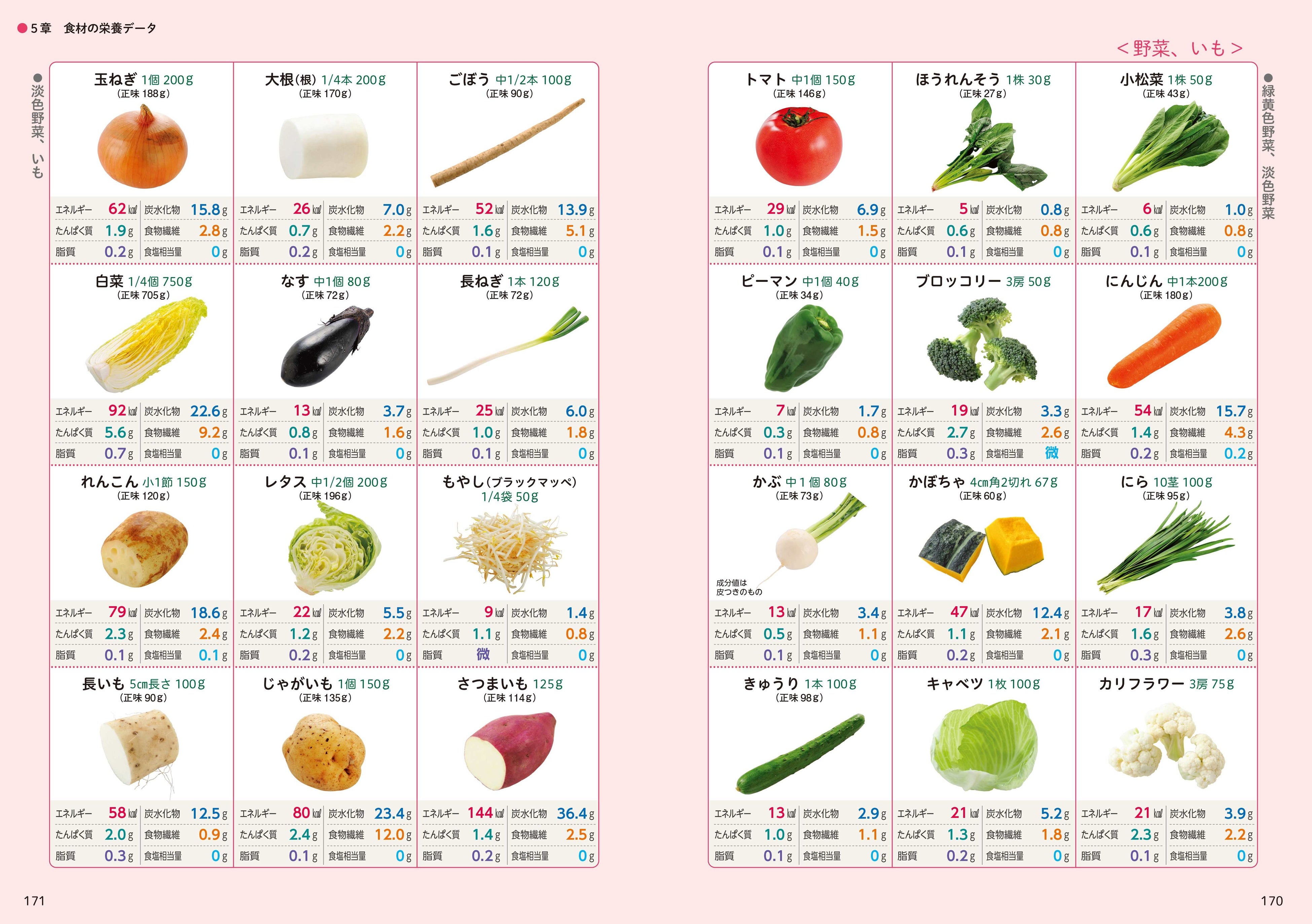 ◎巻末では、日常的によく使う131品の食材栄養データを掲載。ひと目で「エネルギー量」「炭水化物」「たんぱく質」「食物繊維」「脂質」「食塩相当量」がわかります。
