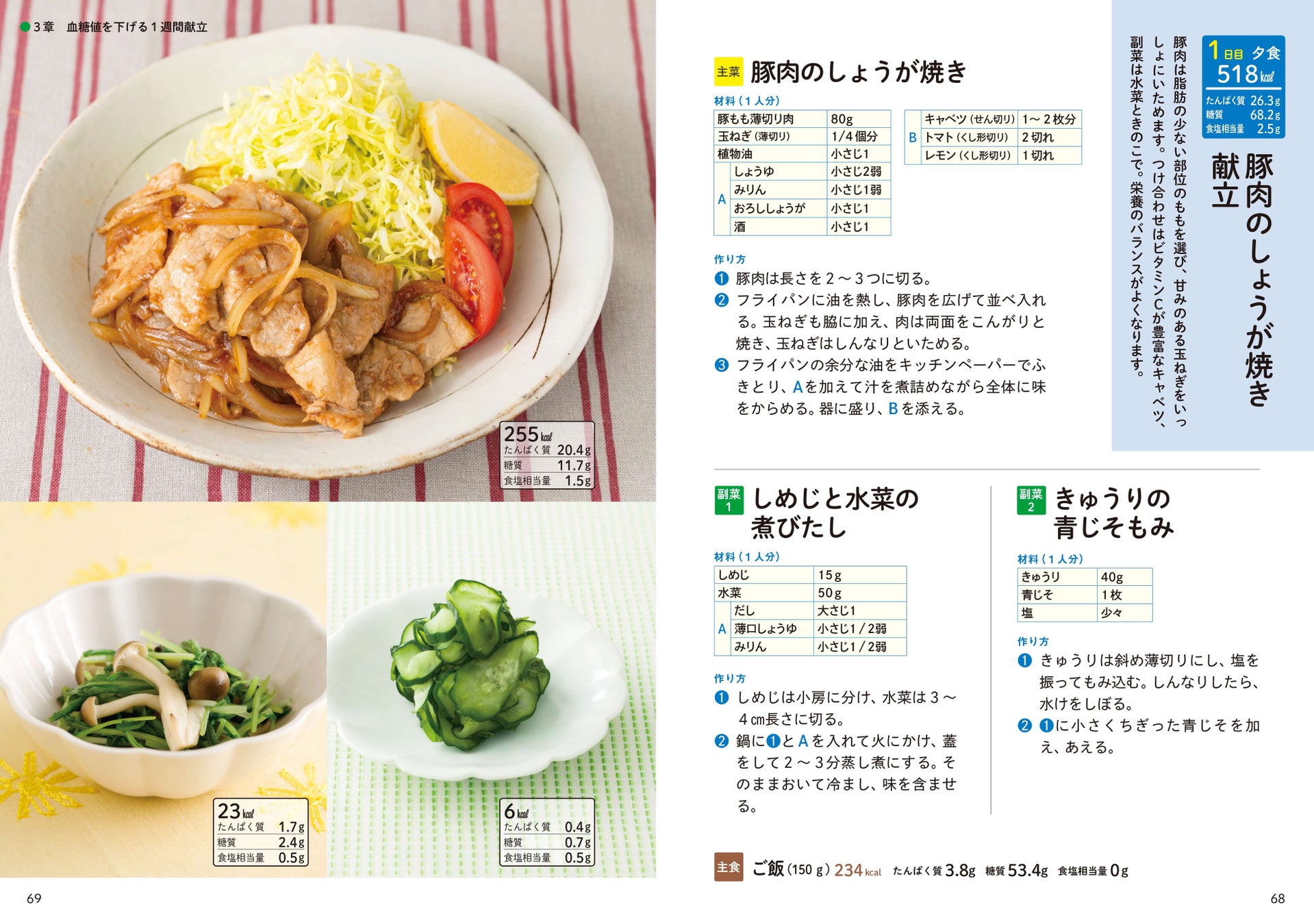 本書では1週間の献立例【3食×7日=21献立】を紹介。1週間この通りに実践することで、食事の量がわかり、目安量が身につくでしょう。