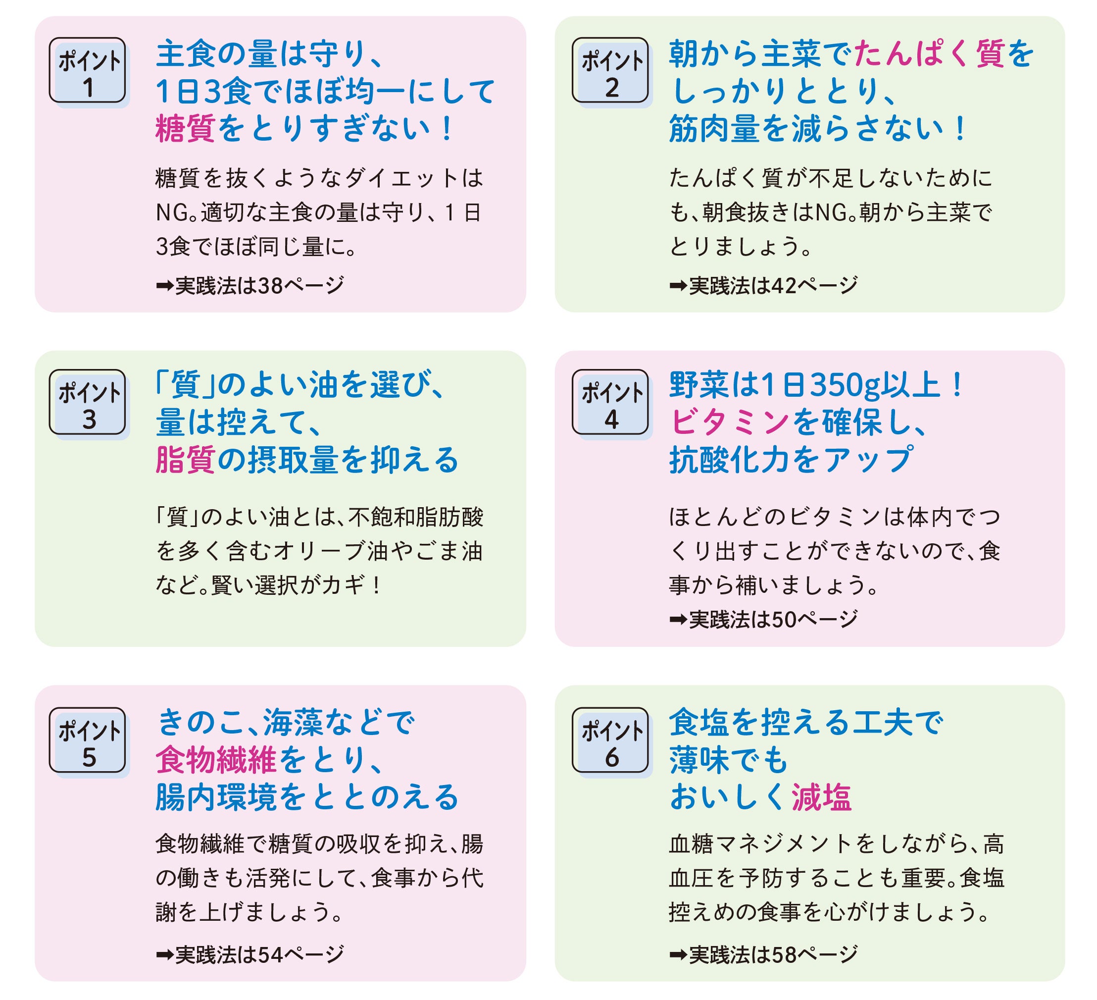 食生活の改善が大事といわれても、いったい何から始めてよいのかわからないという人も多いことでしょう。食事のコツは次のポイントを守ることです。
