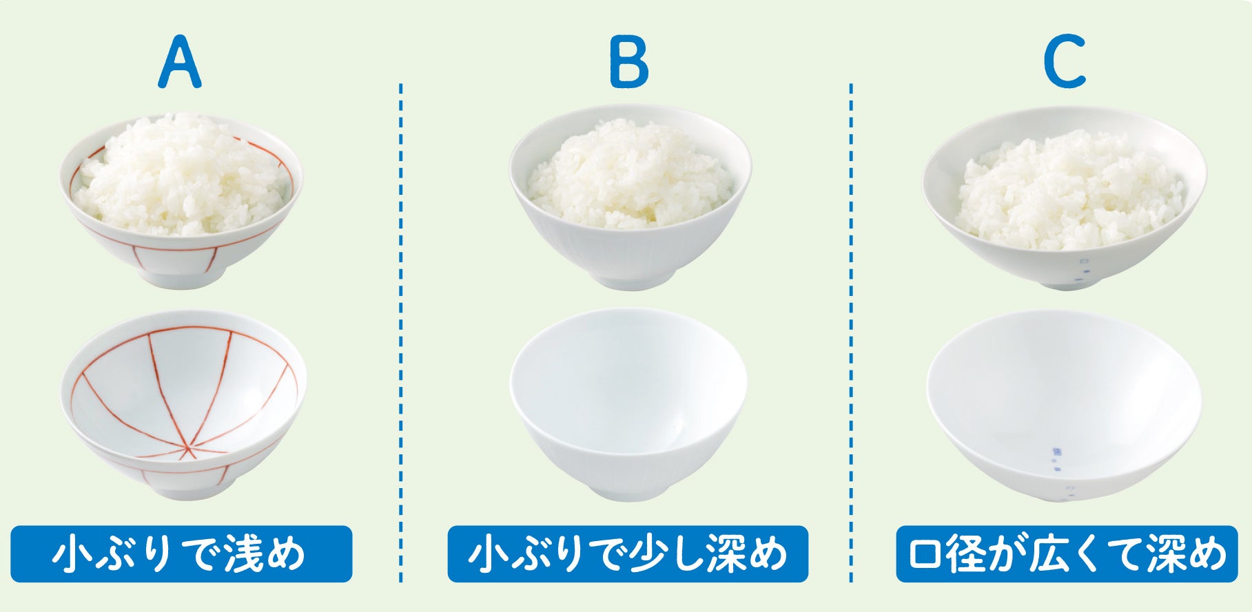 見た目の満足感が得られるように、ご飯茶碗をかえることも有効な方法です。