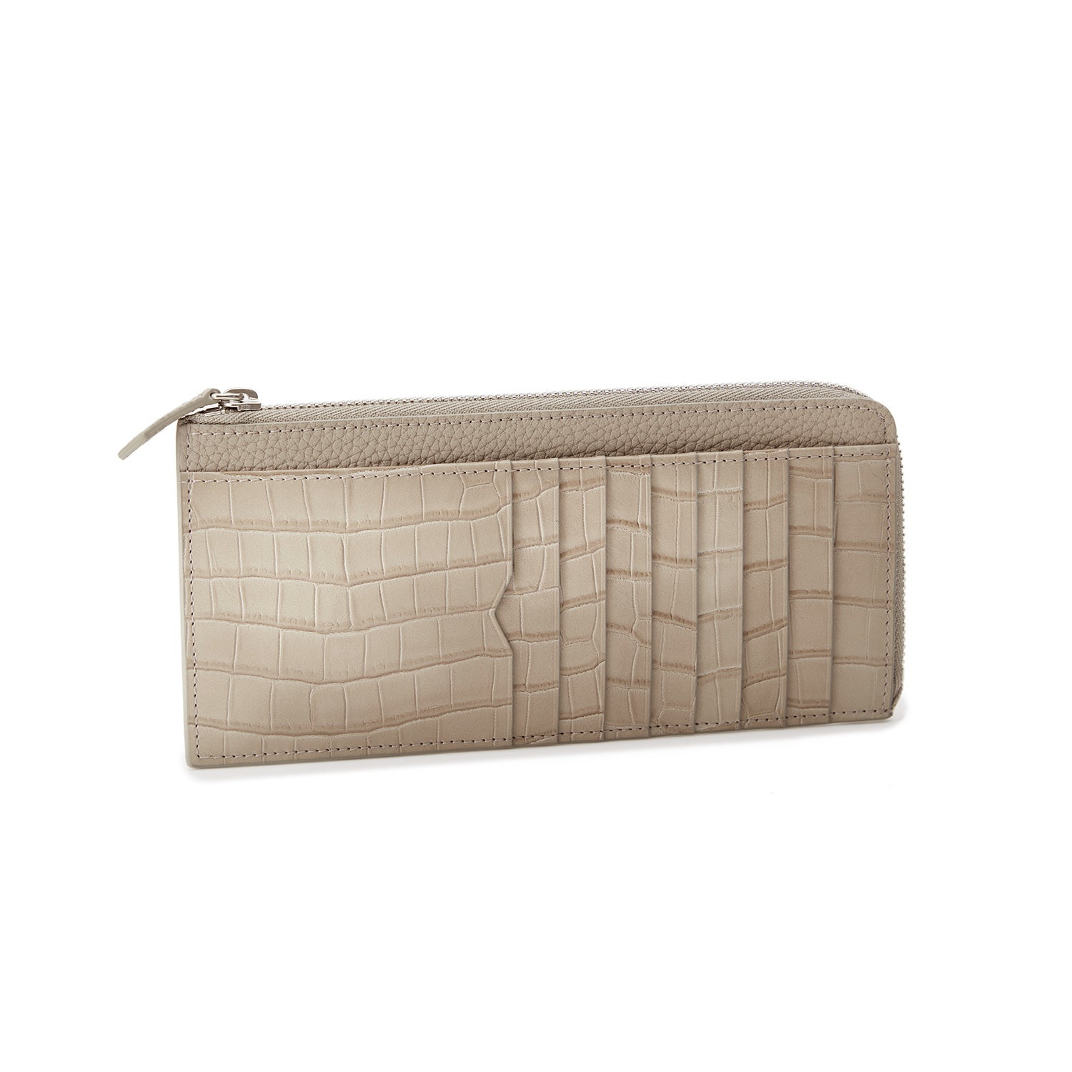 エンボスクロコとシュリンクレザーの組み合わせが、少しエッジの効いたモダンな印象の長財布で、カードポケットとフリーのポケットが外側についており、L字ジップの部分に大きめのマチ付き。