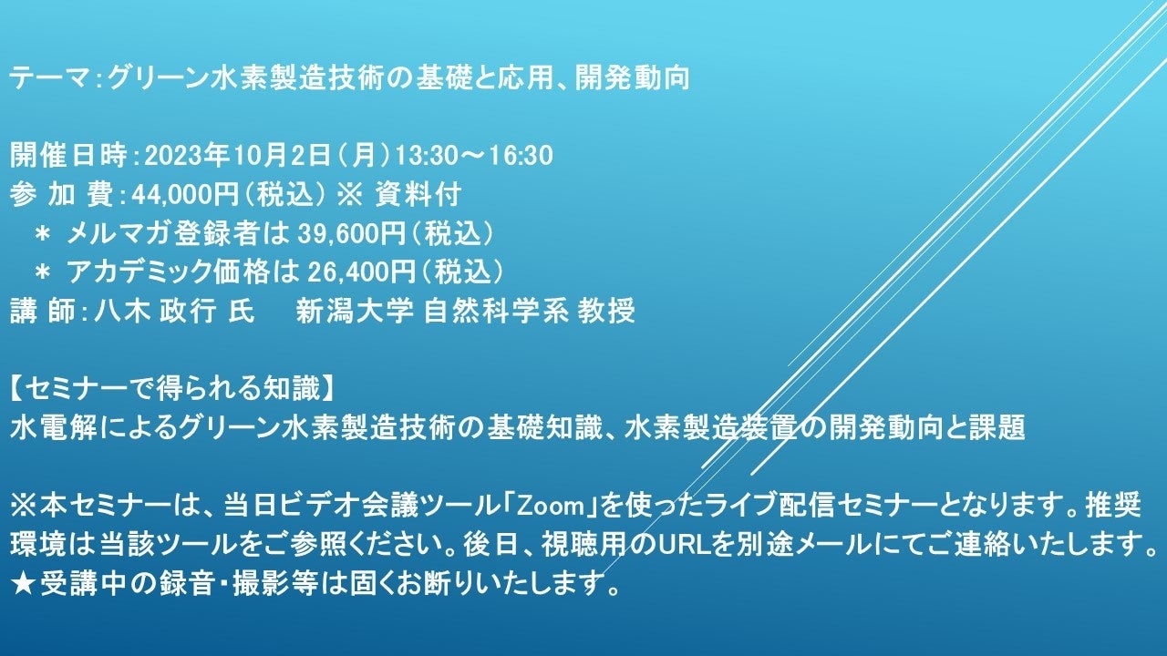 【ライブ配信セミナー】グリーン水素製造技術の基礎と応用、開発動向 10月2日(月)開催 主催:(株)シーエムシー・リサーチ