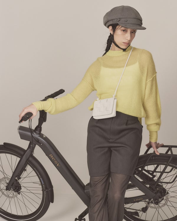 パターンにこだわった立体感のあるエレガントな帽子カバーを装着。後頭部に同系色リボンをあしらい、このリボンによるツバの跳ね上げ構造(特許取得済み)で走行時のバタつきを抑え視認性を確保。今春より新たにストライプ生地と、ボタニカル柄レースのタイプを追加しています。