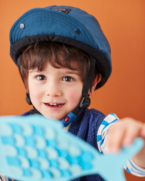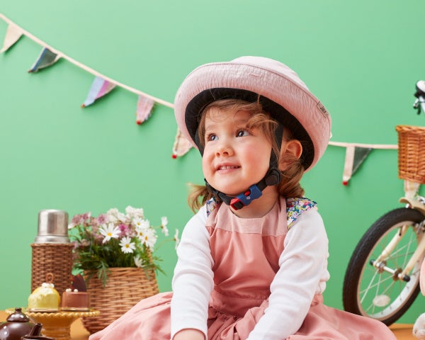 後部に大きなリボンが付いたポークパイハットと、ユニセックスで使えるワークキャップスタイルの帽子カバーを装着した軽量ヘルメット。ボタンによるツバの跳ね上げ構造、ゴム製バンドベルトによるサイズ調整、あごのはさみ込み防止ゴムカバーなど、お子様に安心して気軽にかぶせていただけます。