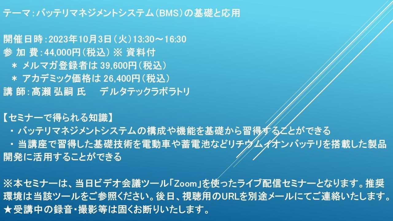 【ライブ配信セミナー】バッテリマネジメントシステム(BMS)の基礎と応用 10月3日(火)開催 主催:(株)シーエムシー・リサーチ