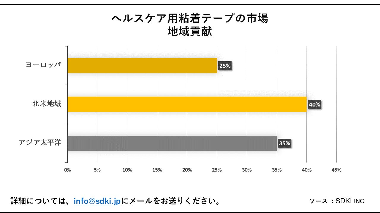 北米地域は、予測期間中に最も速い速度で成長するはずなので、ヘルスケア粘着テープの最も有利な機会を提供すると予想されます。この地域は、2020年に市場の46%の収益シェアを占めています。慢性疾患の増加や外科手術の増加が、この地域市場の成長を支える主な理由です。例えば、2018年には、米国人の27%以上が1つ以上の慢性疾患を抱えており、50%以上が少なくとも1つの慢性疾患を抱えていると推定されています。さらに、同地域では医療インフラの高度化も進んでいます。このことは、国民の意識の高まりとともに、北米におけるヘルスケア用粘着テープの市場成長に寄与すると考えられています。