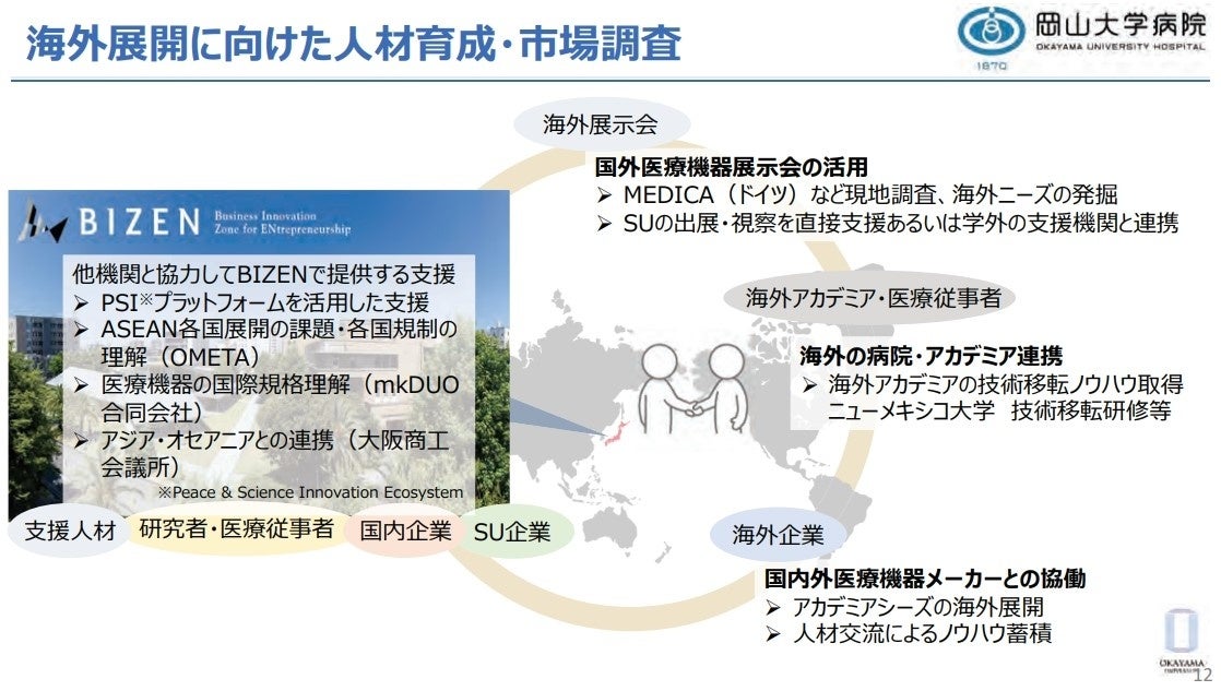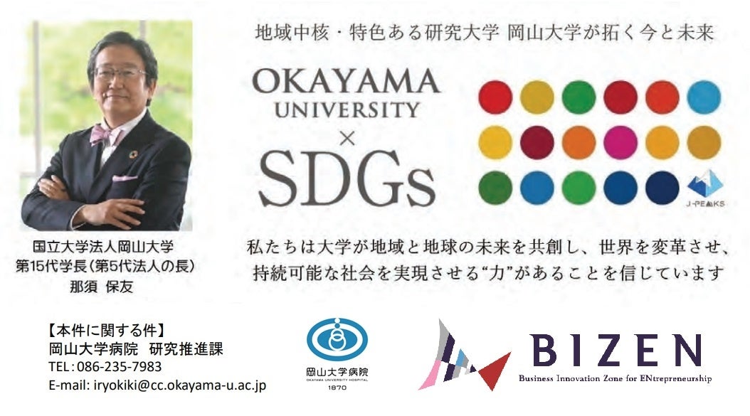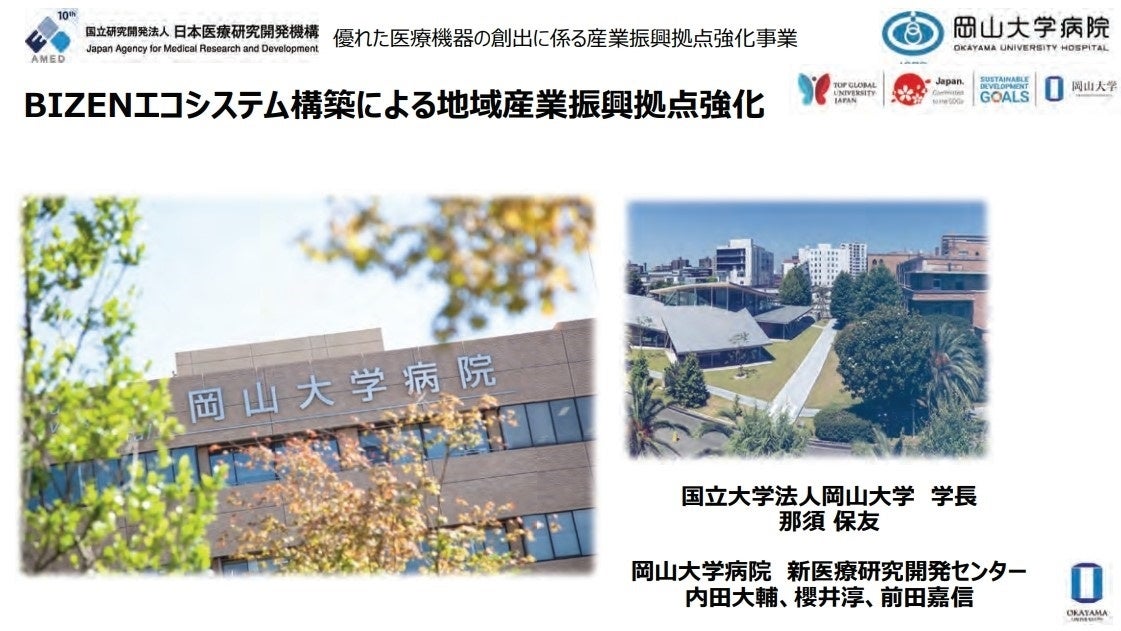 国立大学法人岡山大学(本部:岡山市北区、学長:那須保友)の岡山大学病院新医療研究開発センターの内田大輔講師(特任)、櫻井淳教授、前田嘉信病院長らは、これまでの岡山大学における医療機器開発支援、スタートアップ支援実績を軸として、「BIZENエコシステムによる地域産業振興事業」を計画し、2024年6月25日付で、国立研究開発法人日本医療研究開発機構(AMED)の「優れた医療機器の創出に係る産業振興拠点強化事業(スタートアップ支援強化枠)」に採択されました。