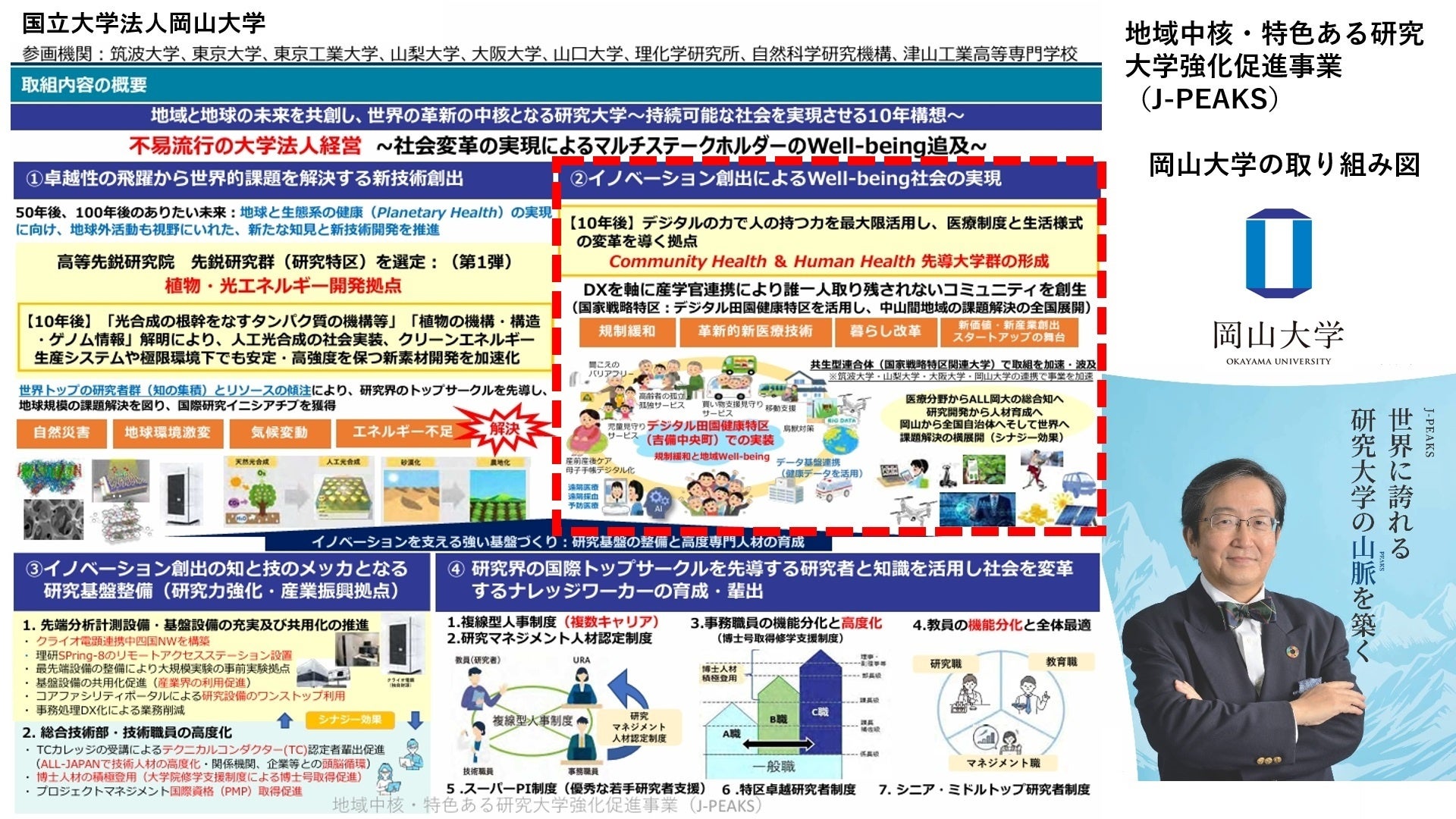 岡山大学 文部科学省「地域中核・特色ある研究大学強化促進事業(J-PEAKS)」に採択~地域と地球の未来を共創し、世界の革新の中核となる研究大学:岡山大学の実現を加速とともに世界に誇れる我が国の研究大学の山脈を築く~
