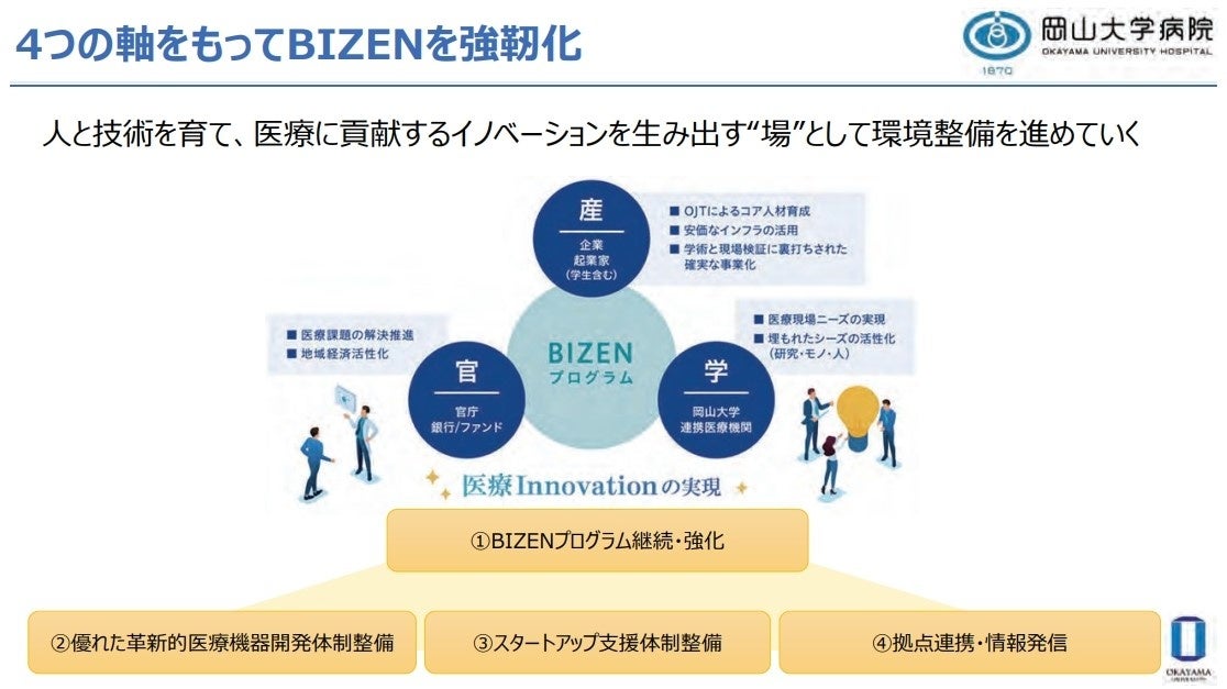 岡山大学は、これまでAMED次世代医療機器連携拠点整備等事業(2019年度~2023年度)の採択を受け、医療機器開発人材育成とスタートアップ創出を目指したオープンイノベーションプログラムBIZEN(Business Innovation Zone for Entrepreneurship)を整備してきました。このプログラムを核とした医療機器開発エコシステムの構築を本学のオープンイノベーション目標として掲げています。BIZENが中心となって、プロジェクトの特性・ステージに応じた適切なコアマネジメントを行う開発・事業化スキームを確立し、医療機器開発からの事業化・スタートアップを通して、岡山から世界へ進出できるようなプロジェクトを育て、地域産業の活性化に繋げていきます。