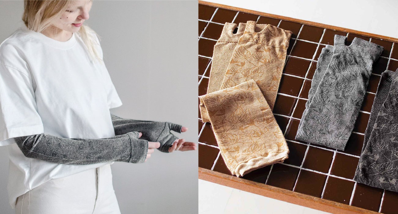 薄手で風を通しやすく、軽やかなメッシュ編みで作ったアームカバーです。二の腕をほどよくカバーする長め丈で、肌側にオーガニックコットンが多く当たるように編んでいます。同色系で表現したテキスタイルが、日々の装いにさりげなく溶け込みます。