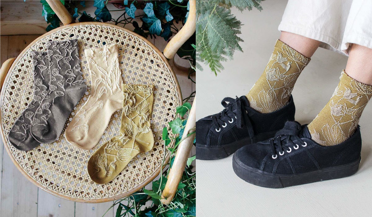 肌側にシルクが多く当たるように編み立てて、むれにくくさらさらしたはき心地が心地よい一枚仕立ての薄手の靴下です。凹凸のある編み技法で表情豊かに仕上げました。同色系の濃淡でまとめたやわらかな配色は、自然豊かなフィンランドの風景を思い起こさせます。