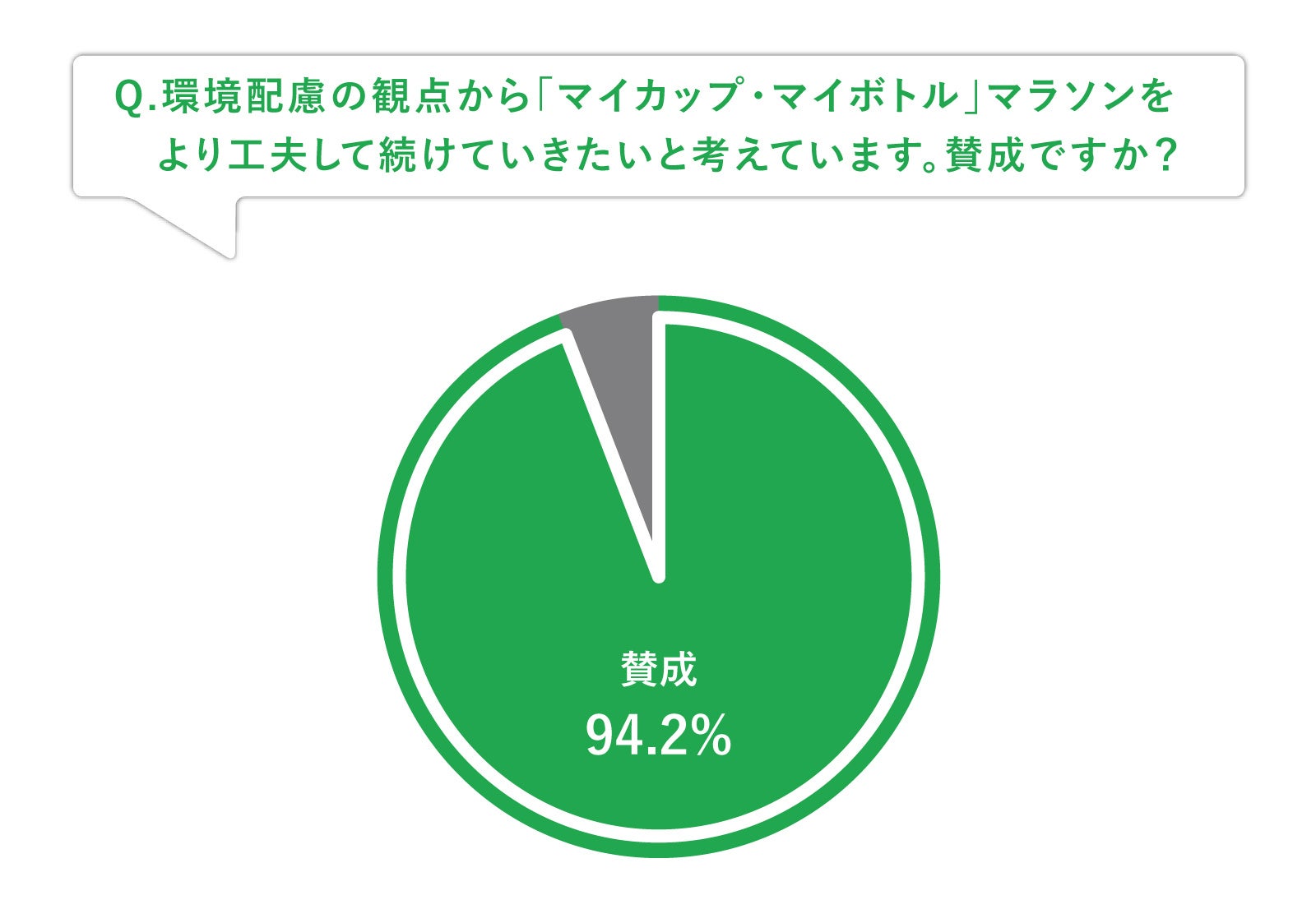 参加ランナー全員がマイボトルを携帯し、コース上に展開される約200箇所の給水ポイントで補給する「マイカップ・マイボトル」マラソンの取り組みについて「賛成」との回答は、94.2%。昨年比8.3ポイント増となりました。アンケートには環境配慮へ向けた前向きなコメントはもちろんのこと、「ゴミが落ちていないコースは綺麗で走りやすい」、「好きなタイミングで給水を摂れるのが良い」、「慣れればタイムへの影響は殆ど無い」など、競技面においてもポジティブなコメントが多数寄せられました。