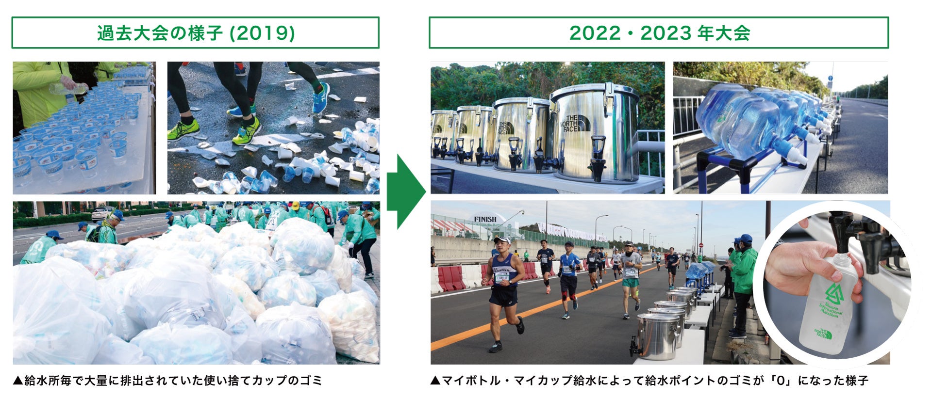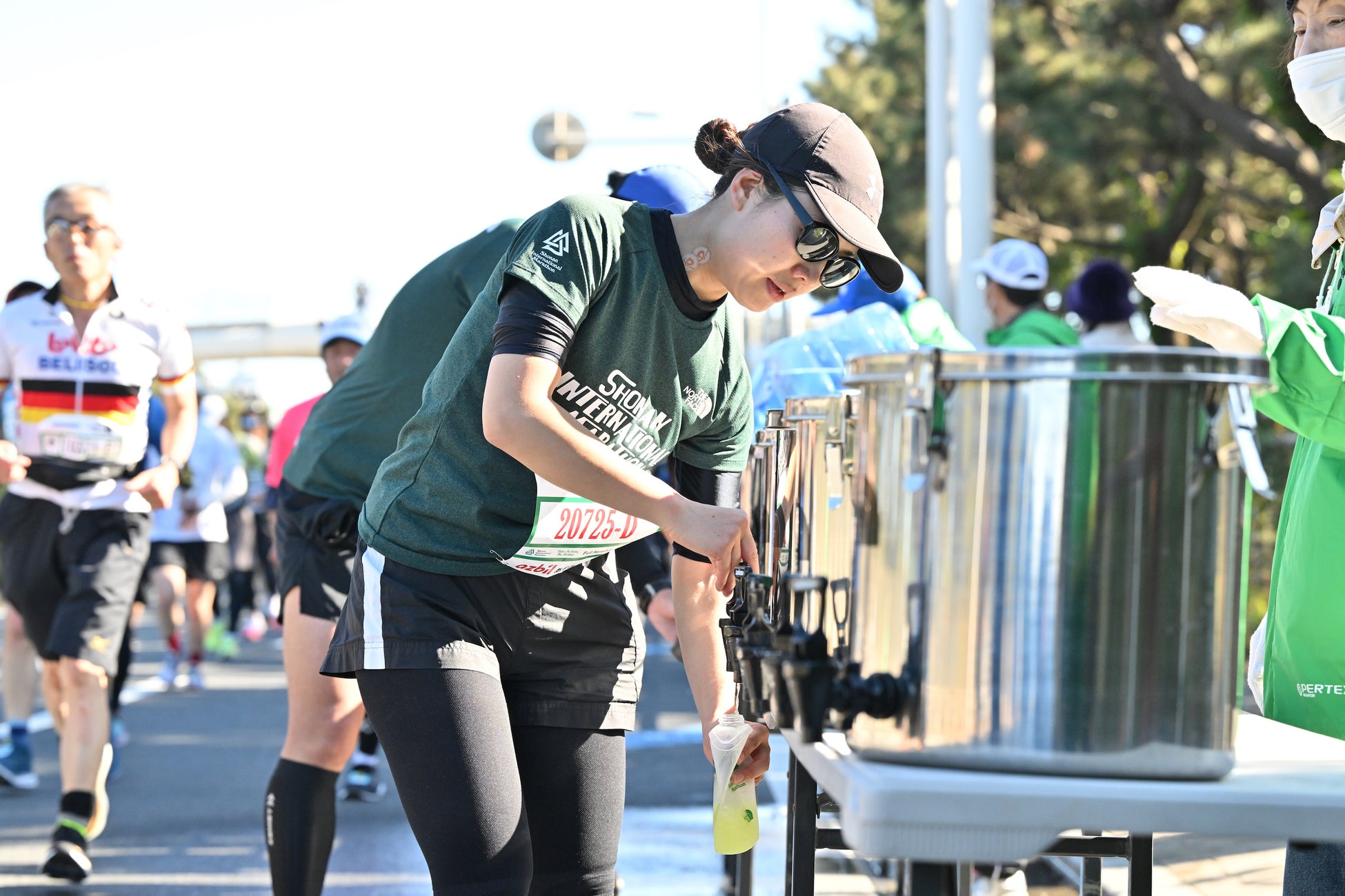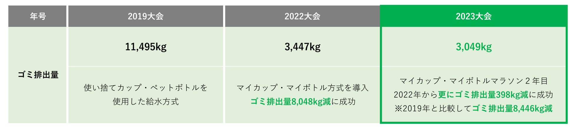 今大会は、昨年と比べ参加者が約4,000人増となったにも関わらずゴミ排出量は398kg減を実現しました。以前の運営方式(2019年大会)では給水において約50万個の使い捨て紙コップ・プラカップ、約31,500本のペットボトルを使用。大会で排出されていたゴミの総量は11,495kgでした。今年はゴミの総量が3,049kgとなり、以前の運営方式と比べると8,446kg減となりました。マイカップ・マイボトル方式をきっかけにゴミゼロの促進をはかった結果、参加ランナーのみならず、運営ボランティア、応援者・来場者すべての皆さんの環境配慮意識が向上していることが見てとれます。
