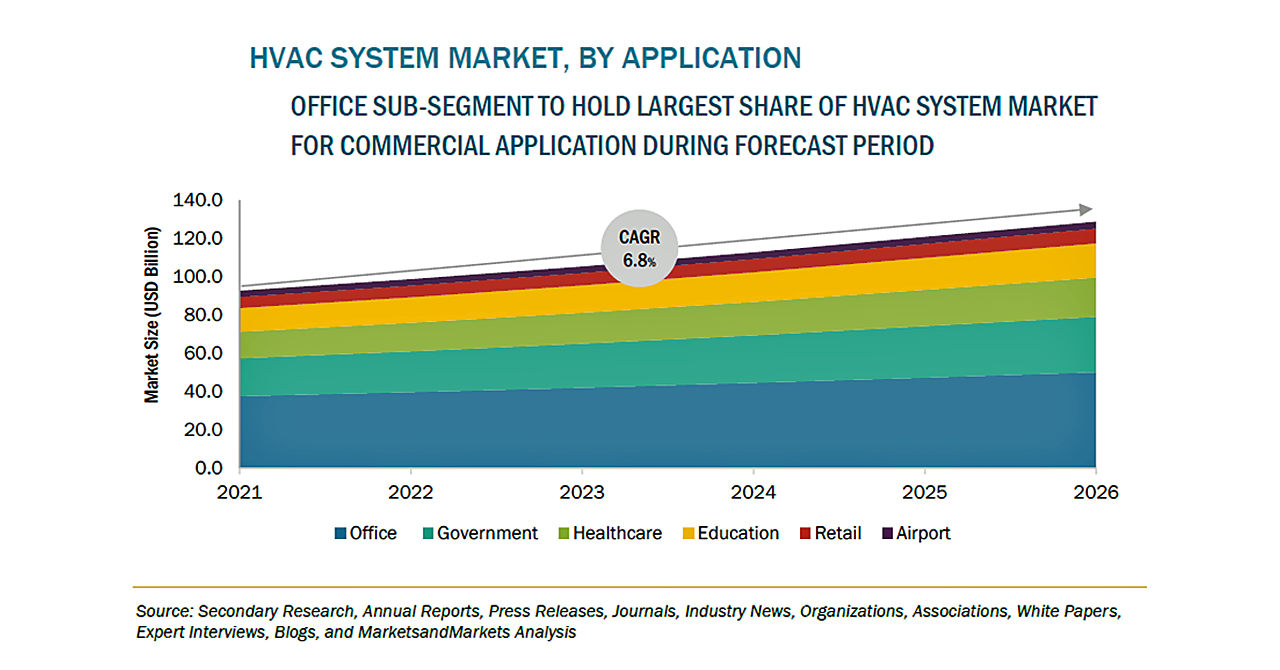 HVACシステムの市場規模は、2021年の1,970億米ドルからCAGR6.6%で成長し、2026年には2,715億米ドルに達すると予測されています。HVACシステムにIoTを導入することで、商業施設や住宅での需要が高まりました。HVACシステムは、異なる技術に基づいたさまざまな機器タイプがあり、その機能は用途に応じて異なります。