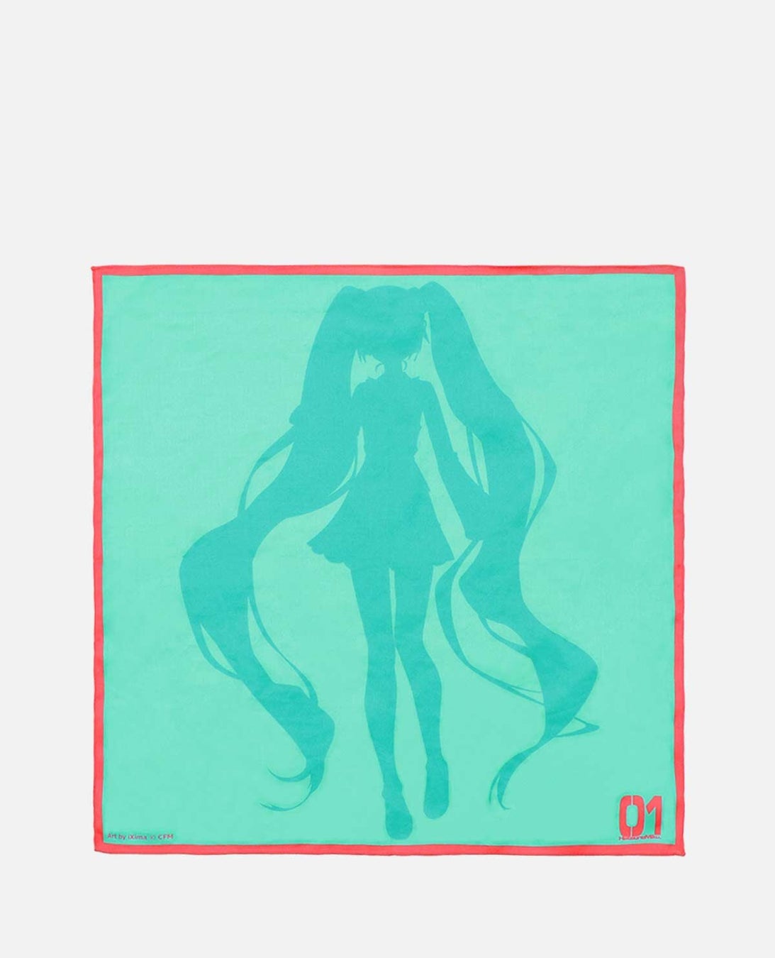 ハンカチーフ全体に初音ミクのシルエットが広がる大胆なグラフィック。ソフトな風合いと上品な光沢感が特徴のコットンを使用。