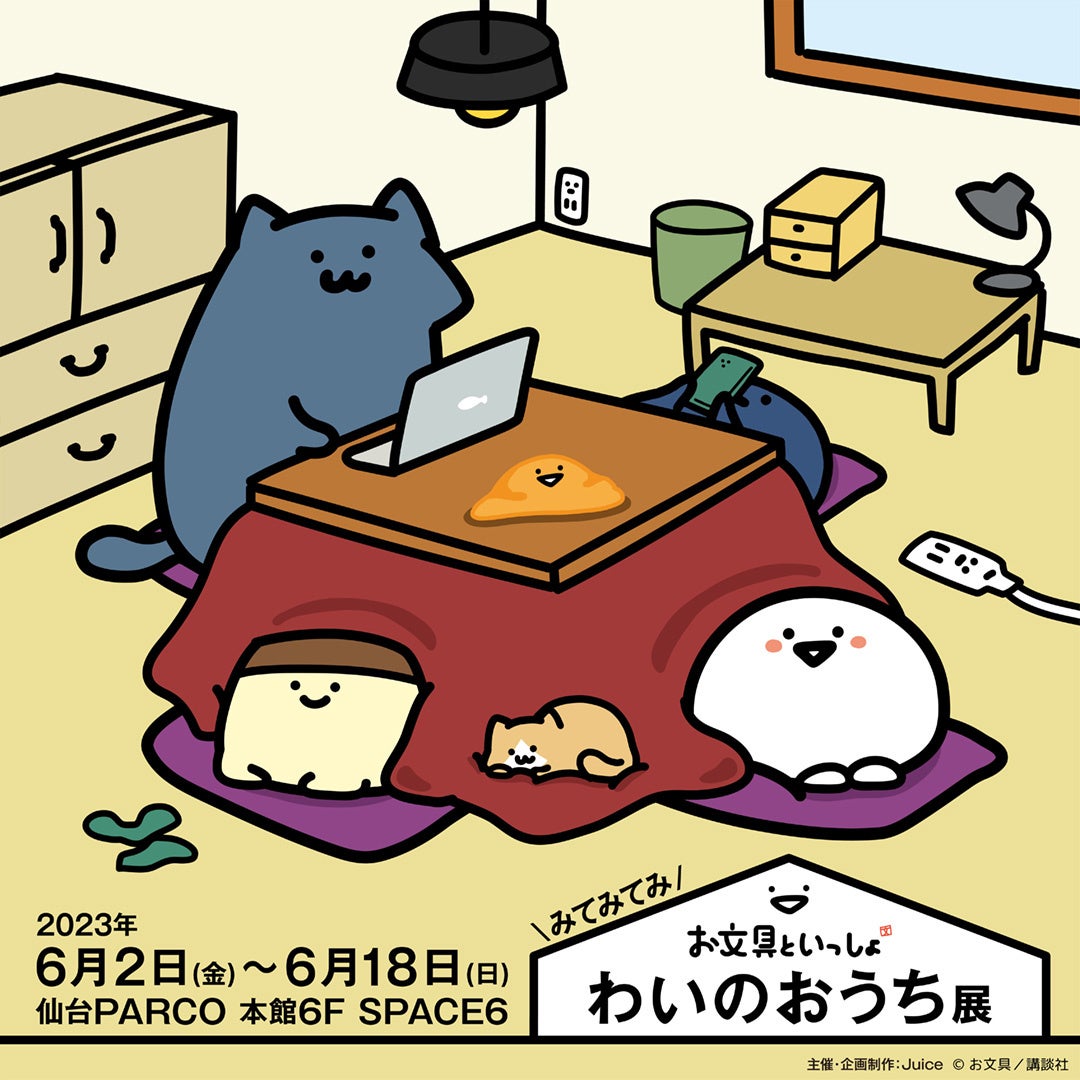 SNSで人気の癒し系キャラクター「お文具さん」。池袋と心斎橋で大盛況だった、キャラクター初となる大型展覧会「お文具といっしょ わいのおうち展」を、2023年6月2日(金)より、仙台PARCO 本館6F・SPACE6で開催いたします。