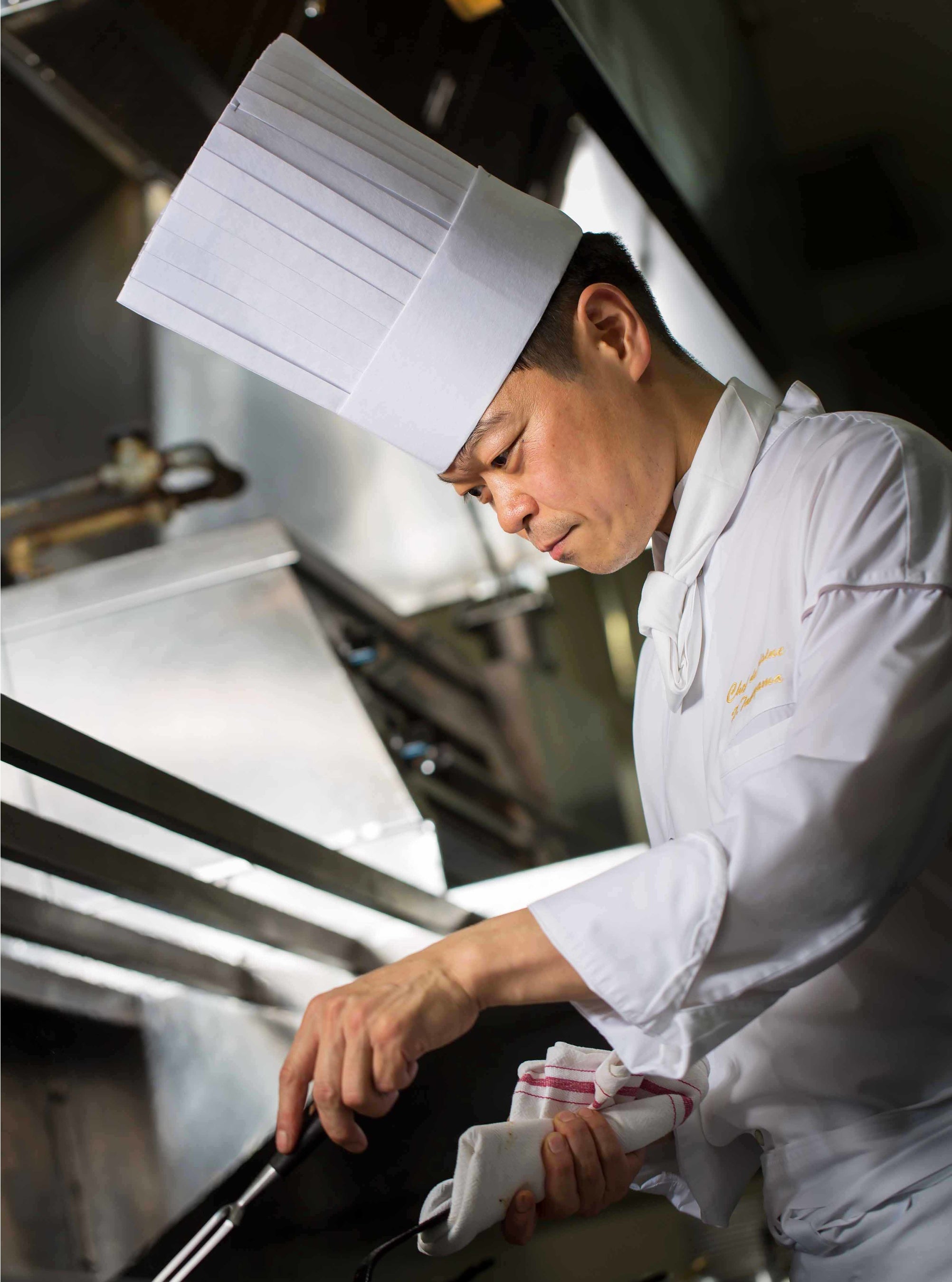 クイーン・アリス銀座店、クイーン・アリス迎賓館を経て、当時石鍋シェフに作った、まかないが目にとまったのがきっかけで、27歳でクイーン・アリス銀座店のシェフとなる。その後、クイーン・アリス晴海店のシェフを経て、2003年より現職。2017年9月、マルセイユの三ツ星レストラン「Le Petit Nice - Passedat」にて研鑽を積む。